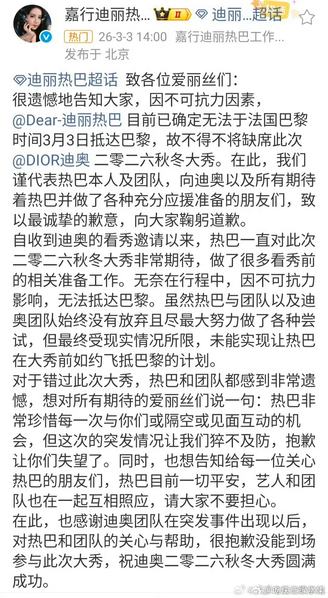 我去 居然缺席了 不过安全最重要迪丽热巴将缺席时装周