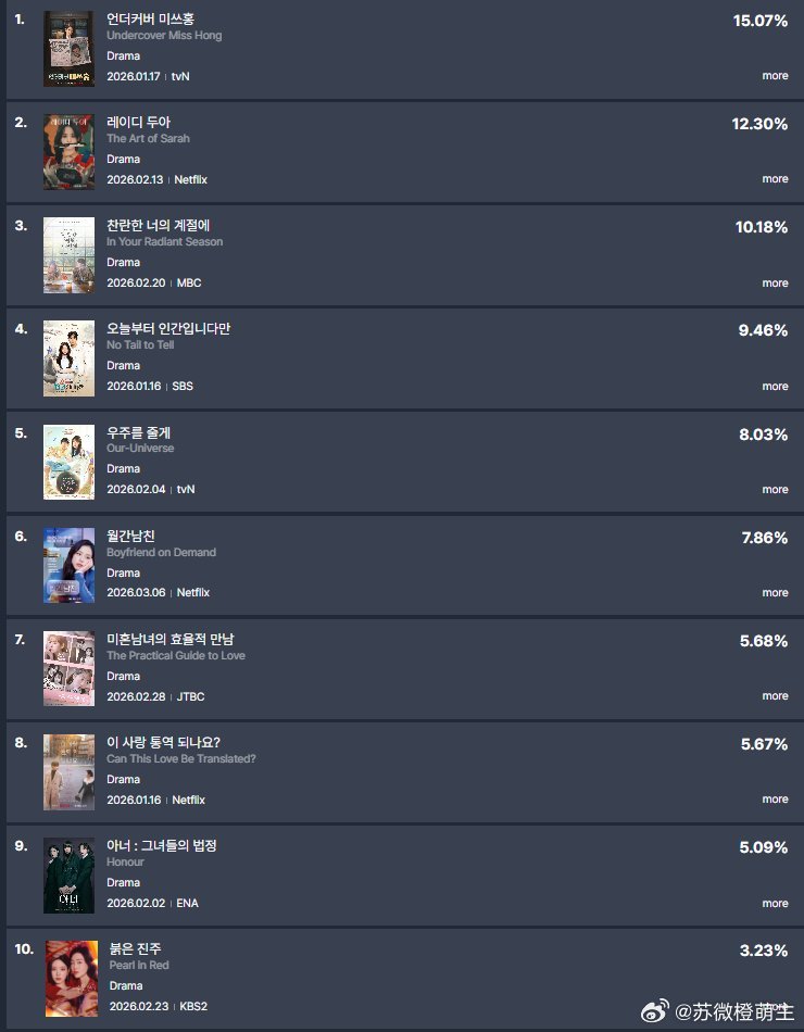 Fundex2月第四周TV-OTT 电视剧及演员话题性电视剧话题性 卧底洪小姐登顶 15.07🏆订阅男友未播出先入榜第六位7.86 金智秀已经位列演员话题性第二位🐮演员话题性前五位都是女演员!!!!!!!!👍朴信惠 一位 6.10%金智秀 二位 5.46%申惠善 三位 4.18%韩志旼 四位 3.77%金惠奫 五位 3.67%