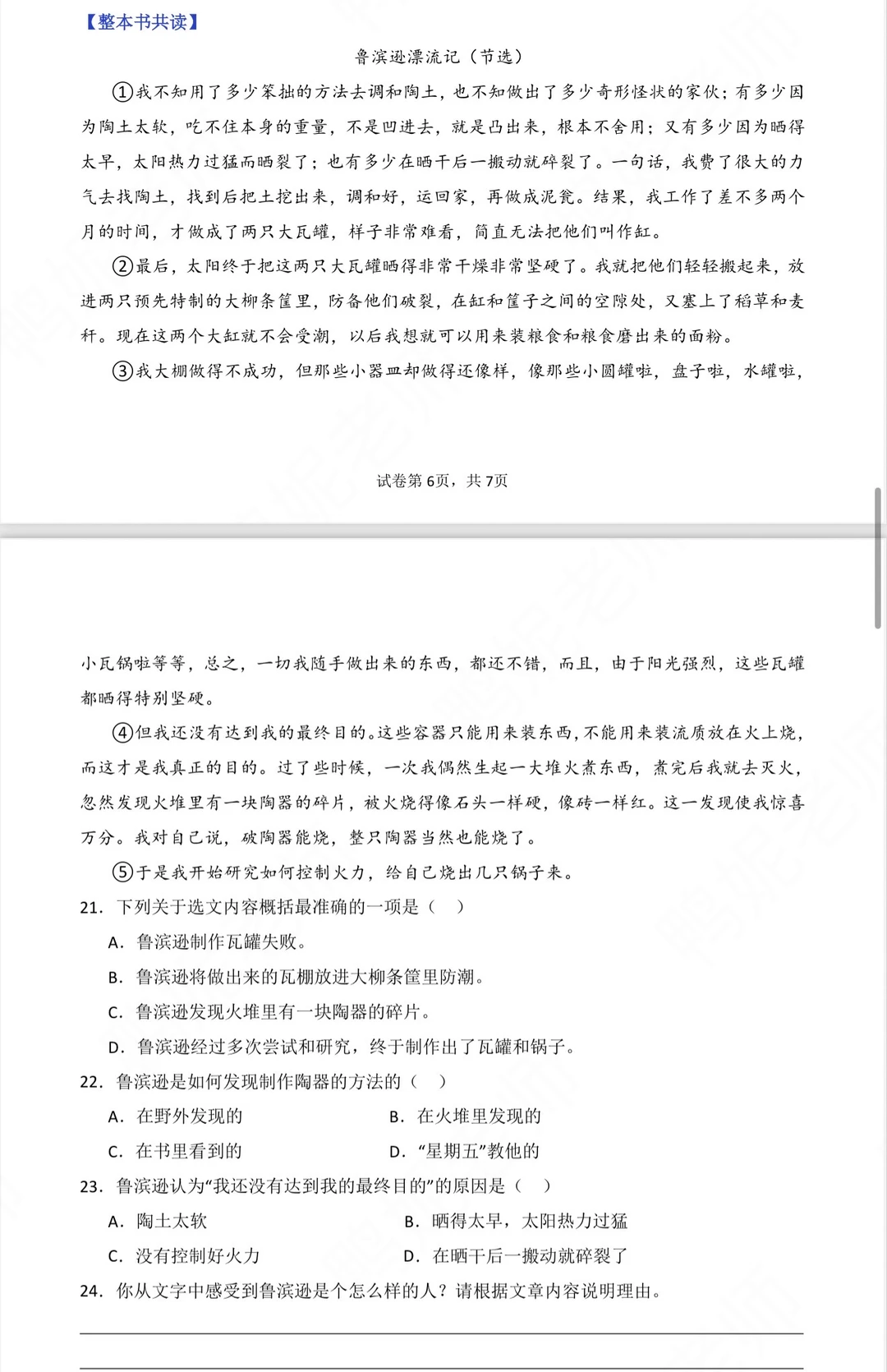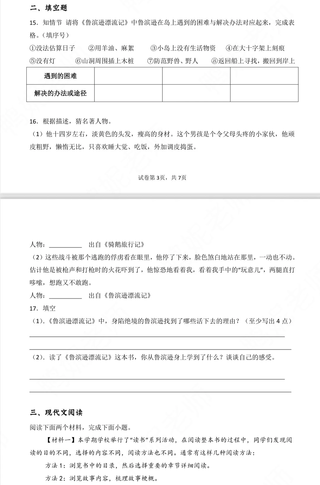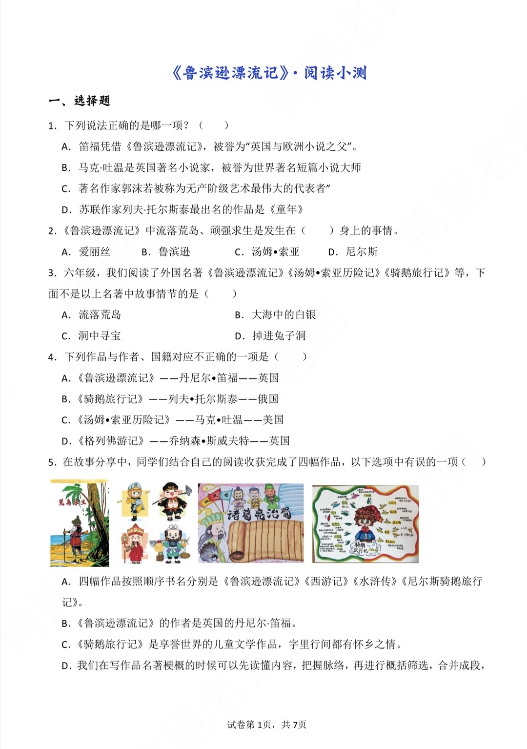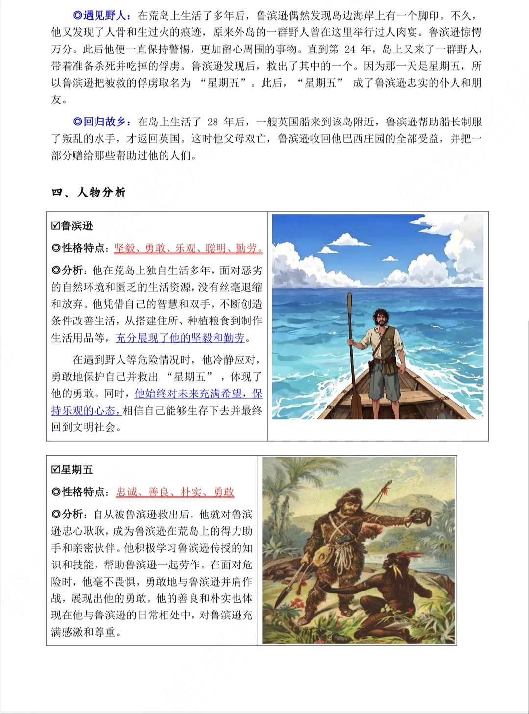 今天把《鲁滨逊漂流记》的课文和笔记梳理了一遍,顺便把名著导读中的作品简介、人物介绍和故事梗概也一并梳理出来了,后期方便学生课前熟悉和考前识记。 顺便找了一些测试题,有选择题、填空题和整本书阅读,检测学生对这本书的大致理解。