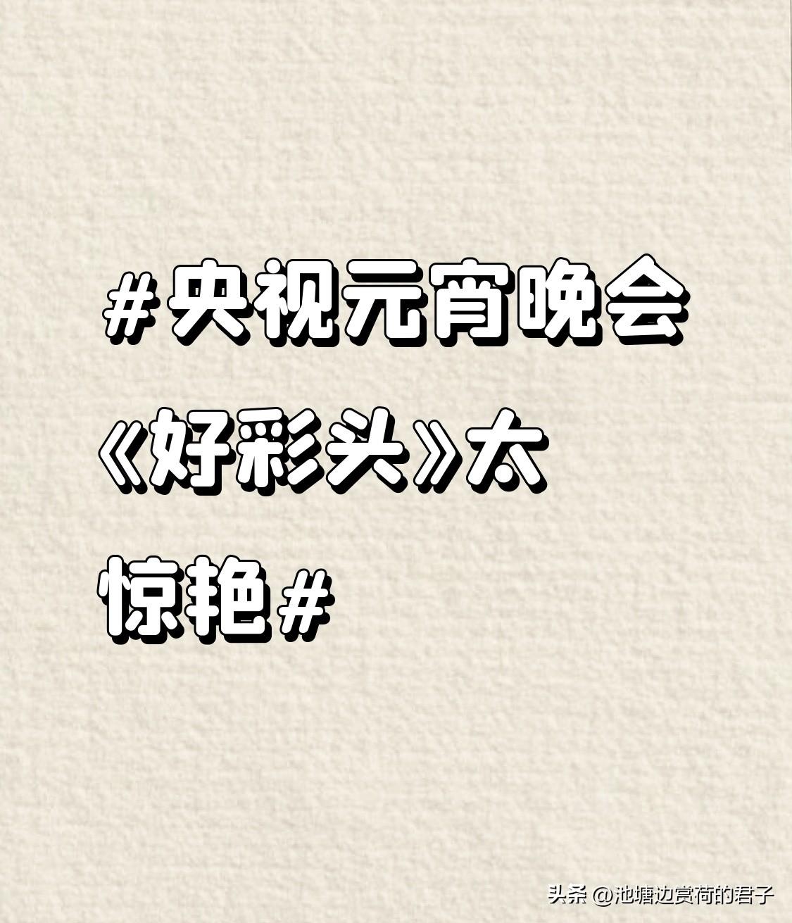 央视元宵晚会《好彩头》太惊艳 央视元宵晚会的《好彩头》真的绝了,太惊艳!节目里那欢快的节奏一响起,瞬间就把人拉进热闹的氛围。舞者们身着色彩鲜艳的服饰,动作轻盈又灵动,每一个转身、每一次跳跃都充满活力,仿佛把好运都带到了现场。舞台设计也超用心,灯光璀璨,各种元素巧妙搭配,营造出喜气洋洋的感觉。而且节目融合了多种传统元素,让人在欣赏舞蹈的同时,也感受到了浓浓的节日氛围和文化底蕴。这节目就像一个大大的好彩头,给观众送来了满满的欢乐和祝福。