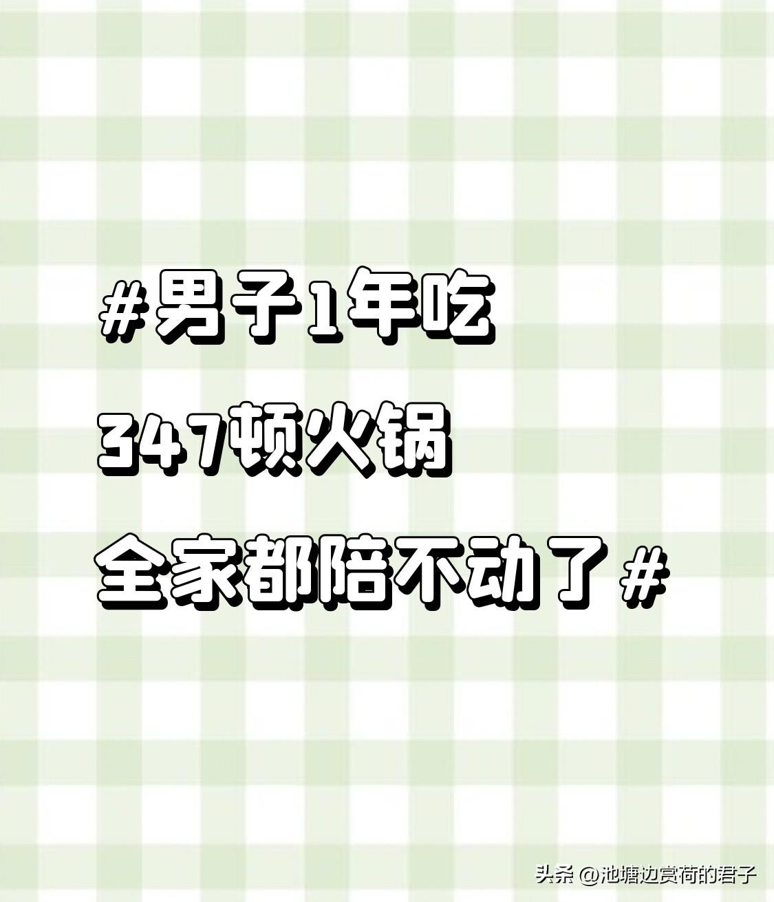 男子1年吃347顿火锅 全家都陪不动了 “男子1年吃347顿火锅,全家都陪不动了”这话题一上热搜就火了。这位大哥是锅圈食汇创始人杨明超,他觉得吃火锅能感受生活烟火气,这想法挺妙的。但一年365天吃347顿,平均下来近乎每天都吃,谁受得了啊! 开始家人还陪着,后来都被这火锅味整怕了,朋友聚餐也躲着火锅局。网友调侃他把火锅当主食,把蘸料当信仰,虽说有点夸张,但也挺形象。火锅虽好吃,可也得照顾家人感受和自己身体呀,毕竟生活不是只有火锅这一道菜嘛。