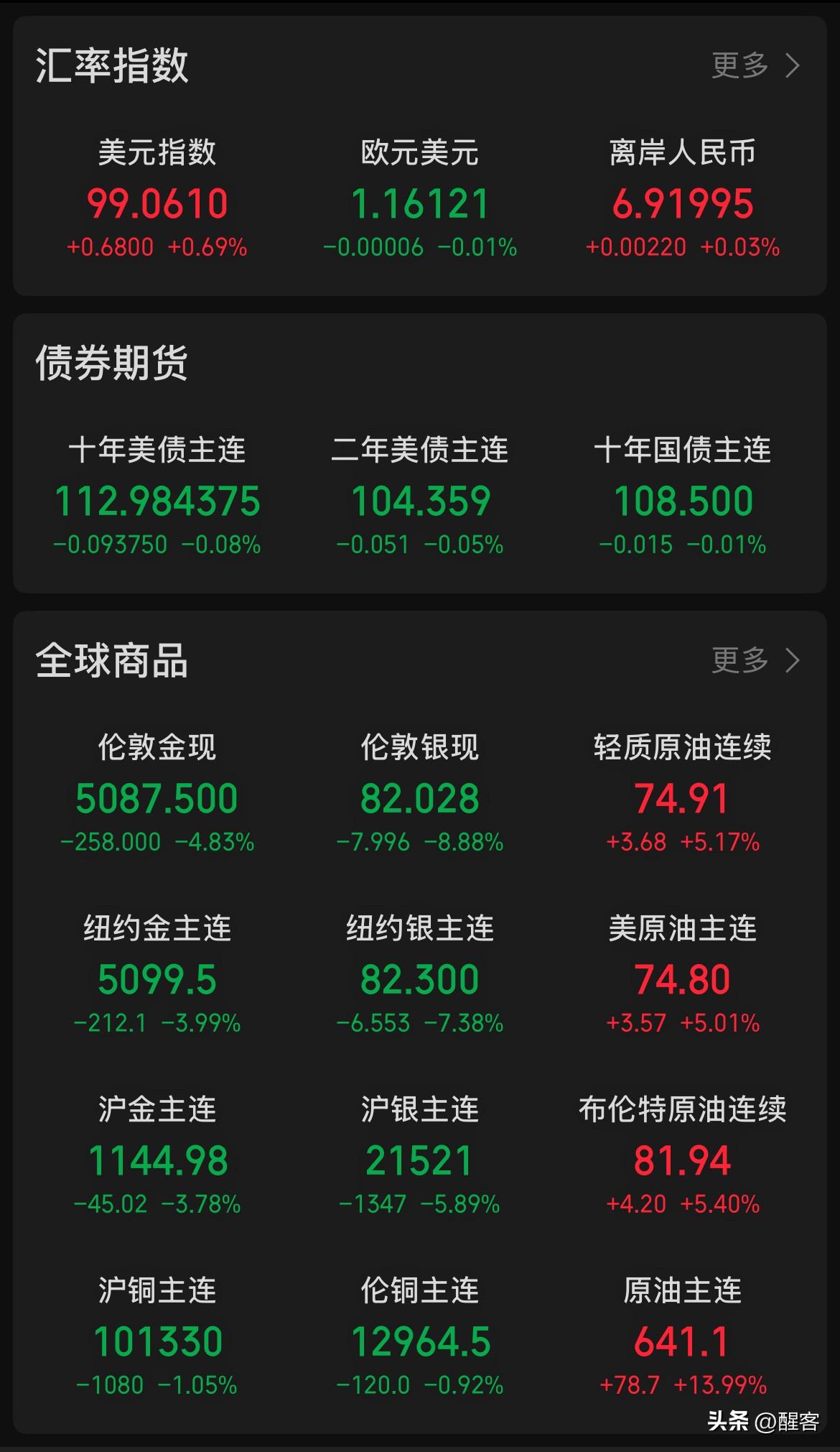 美元指数重回99,美股集体下跌但扛住了大跌的压力,贵金属大幅调整,十年期美债收益率下降,说明美元为代表的避险资产成为重要选择,同样也说明华尔街的金融机构正在进行一场全世界的收割和美元霸权机会主义的提升活动。 战争从来不仅仅是灾难,对于以金融立国的美国来说打一场战争,拿到能源、拿到控制权,最重要的是全世界的资金再一次回到美国。