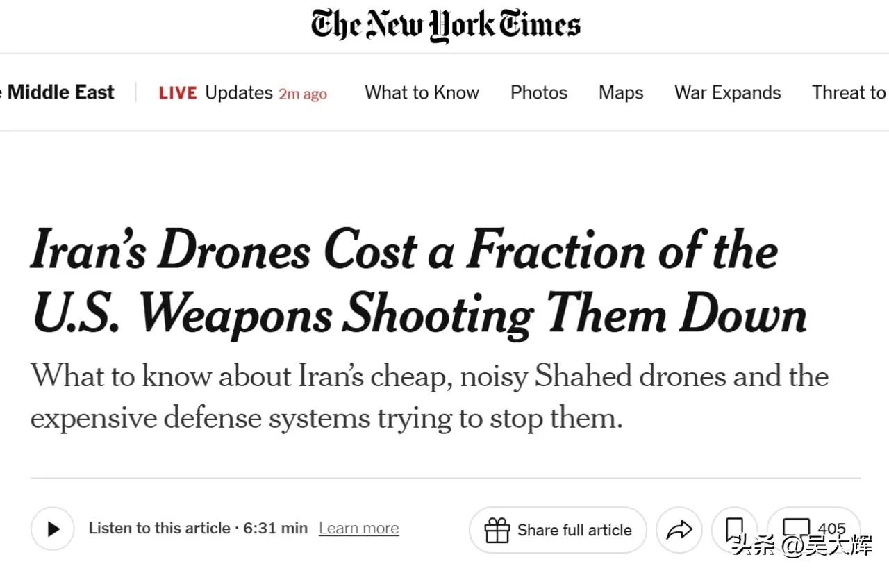 伊朗正在大量消耗美国及盟友的弹药库存 记得美国在对伊朗发动战争之前,我国复旦大学沈逸教授就曾预测:“老美准备兵力很充分,但弹药恐怕准备不足。”现在形势的发展可能完全印证了神毅教授预测的正确性,因为我国著名的俄罗斯问题专家,清华大学国际关系学系教授吴大为先生通过纽约时报的报道,发现《伊朗用廉价无人机消耗美国及其盟友的导弹库存》,结论好像美国人可能也不一定承受得起。 文章说,美国在伊朗上空拥有制空权,但数学计算未必站在美国这边,伊朗正在中东地区使用低成本无人机实施高精度打击,而美国及其盟友是能够拦截绝,但这些防空装备造价高昂。 吴大辉教授得出的结论是:这一问题正在迫近,在一个攻击型无人机廉价、防空拦截昂贵的世界里,长期来看防御方的成本将变得难以承受。 清华吴大辉教授的研究结果,应该和复旦沈逸教授的预测是不谋而合,美国和以色列打击伊朗的战争才开始了几天,我们吴大辉教授就已经发现了这一问题,而沈教授早就有了预测,特朗普还说要到四个星期呢,按照的我们两位专家的说法,美国可能连弹药都消耗不起,他们还能将这场战争打下去吗? 从这里可以完全看出来我们专家学者的厉害之处,哈马斯当时没有完全领会我们李专家的意见,最后被打的丢盔弃甲,现在特朗普如果不听从我们沈吴教授的,下场一定也很难看。