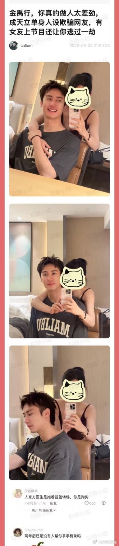 曝金禹行上恋综时有女友 金禹行被曝在录制《心动的信号8》期间已有稳定女友,却以单身身份参与节目并与女嘉宾暧昧互动。女友透露,金禹行每周在浙江嘉兴录制地与她约会,并禁止她观看节目,称“怕被他的演技吃醋”。节目播出后,金禹行在镜头前与孙涵清、王艺帆等女嘉宾进行热气球约会、牵手等亲密互动,甚至与王艺帆组成“金艺CP”收获观众好感,直至2026年1月分手后,女友才曝光此事。
