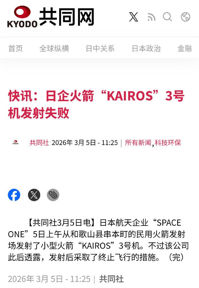 一鸽再鸽,鸽不过去了,一射就还是失败了! 3月5号上午,日本商业航天公司“太空一号”终于把KAIROS3号火箭送上了天,可谁能想到,这枚拖了又拖、改了又改的火箭,升空后没多久就飞行姿态不稳、轨迹异常,最终被公司紧急终止飞行,发射任务彻底泡汤。 这已经是该型火箭连续第三次失败了,2024年3月第一次发射,升空数秒就爆炸解体;当年12月第二次尝试,发射后不久就被迫中止。 这次原本定在2月发射,因天气等原因多次推迟,4号还临时触发安全系统紧急停射,好不容易熬到5号发射,结果还是重蹈覆辙,说句实在的,这样的成绩实在让人瞠目结舌。 可能有人觉得,一次两次失败很正常,但连续三次栽跟头,就不是运气差那么简单了,这背后全是日本航天领域的拉胯真相。 日本一直自诩科技强国,在汽车、电子等领域确实曾经有过亮眼表现,可在航空航天这块,却始终不尽如人意,甚至可以说是漏洞百出。 不光是KAIROS系列火箭,日本另一款主力火箭H3也屡屡掉链子,多次发射失败,核心故障反复出现,为了省钱用民用零件替代航天级部件,压缩测试周期,最后只能自食恶果,连国际客户都不敢再找他们合作,订单一个个流失。 现在的日本,别说让火箭发射成功,后续能不能造出火箭都是个未知数,多重危机已经把他们逼到了绝境。 首先就是我们的两用物资出口管制,就在上个月24号,中国商务部已经把20家日本实体列入出口管制名单,其中就包括日本宇宙航空研究开发机构和三菱重工等造火箭的核心企业。 能源供应更是雪上加霜,2月28号霍尔木兹海峡被全面封锁,全球五分之一的海运石油都要从这里过,而日本95%以上的石油都依赖中东进口,全得走这条航道。 造火箭需要大量石油相关的能源和材料,现在海峡封锁,油价飙升,不仅造火箭的成本翻了又翻,后续能源能不能稳定供应都成了问题。 俄罗斯那边也没给日本留余地,之前日本追随美欧制裁俄罗斯,被俄方列为“不友好国家”,俄罗斯对日本的油气供应进行了严格管控,日本9%的液化天然气都来自俄罗斯的萨哈林2号项目,现在俄方收紧管控,日本的能源缺口又大了一块。 外部麻烦不断,内部还被美国死死压榨。从当年的广场协议让日元升值、出口受挫,到现在逼迫日本开放市场、多承担驻军费用,美国一直都在吸日本的血。 日本本来就没多少资金投入航天领域,被美国这么一压榨,研发经费更是捉襟见肘,连维持现有研发团队都困难,更别说投入资金攻克火箭技术难关了。 再看日本国内,经济早就陷入了困境,核心消费价格指数连续53个月上涨,物价居高不下,老百姓日子不好过,政府财政紧张,原本就有限的经费,根本挤不出多少投入航天。 之前有专家预测,要是霍尔木兹海峡长期封锁,日本经济增速可能接近停滞,到时候别说造火箭,就连基本的民生保障都要打折扣。 日本航天的三连败,从来都不是偶然,曾经号称科技强国,如今在航天领域却屡屡碰壁,更面临着后续造不出火箭的危机。 说白了,这都是日本自己选的路,一边依附美国被吸血,一边四处树敌遭制约,再加上自身技术和经济的硬伤,未来日本航天想要翻身,恐怕难如登天。