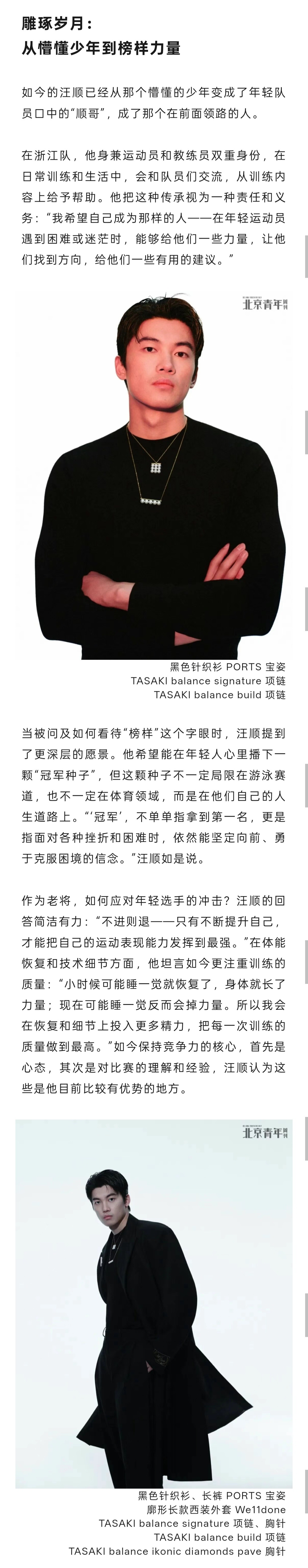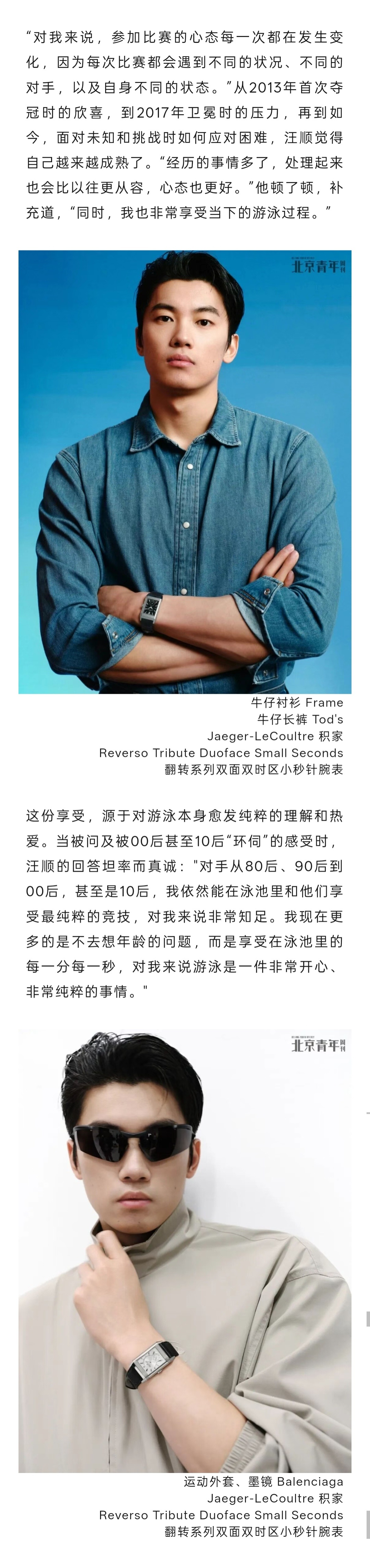 “以前我不理解什么是真正的喜欢和热爱,后来我发现,在休息或放假时,游泳已经融入了我的生活。它带给我一种很好的生活方式,也让我从不同角度认知体育,带给我很多快乐。这种快乐是纯粹的——有人从美食中获得,有人从工作中获得,而我从运动中获得。”
