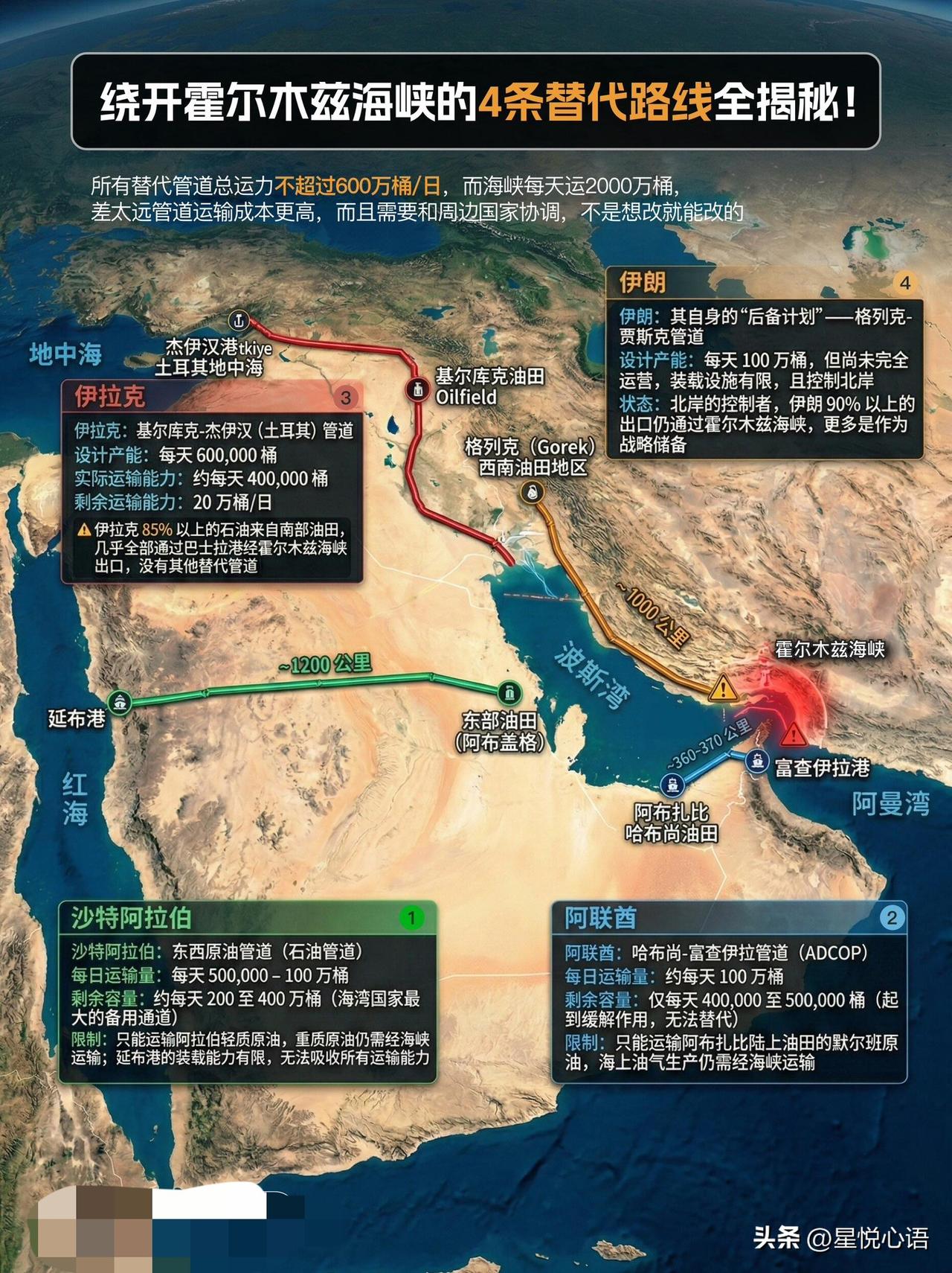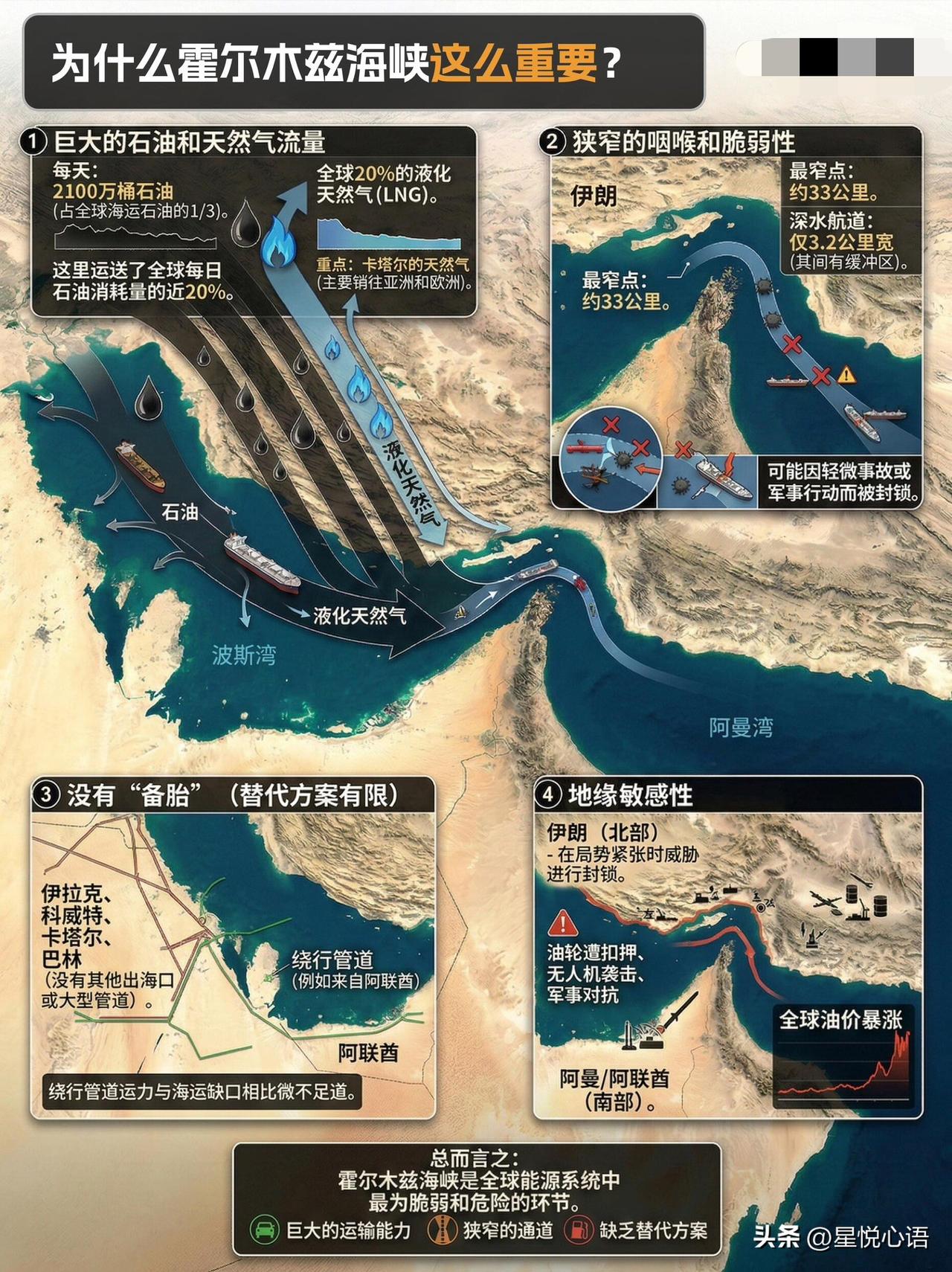 霍尔木兹海峡为何如此重要,一图带您了解! 只因它妥妥的全球能源命门, 这地方的重要性,真的超出想象。 每天运2100万桶石油,占全球海运石油1/3。 还扛着全球20%的液化天然气运输。 沙特、伊拉克、阿联酋、伊朗、科威特。 前五产油国占了海峡运输量的93.6%。 几乎垄断了波斯湾的能源出口。 总有人说有替代管道能绕开。 可现实真的太骨感。 四条替代路线总运力才600万桶/日。 连海峡的三成都不到。 还各有各的限制,重质油、海上油气还得走海峡。运输成本更高,协调周边国家也难。 这海峡的地理条件更是把脆弱拉满。 最窄处才33公里,深水航道仅3.2公里。 伊朗掌控北岸,地缘一紧张就有封锁风险。 一点风吹草动,全球油价就跟着震荡。 现在中东局势升级,海峡通航都受影响。 这也让我们看清, 全球能源供应链太依赖这一处了。 没有靠谱的替代方案,就是最大的隐患。 各国真得加快能源多元化布局。 不然只能被这道海峡牵着鼻子走!