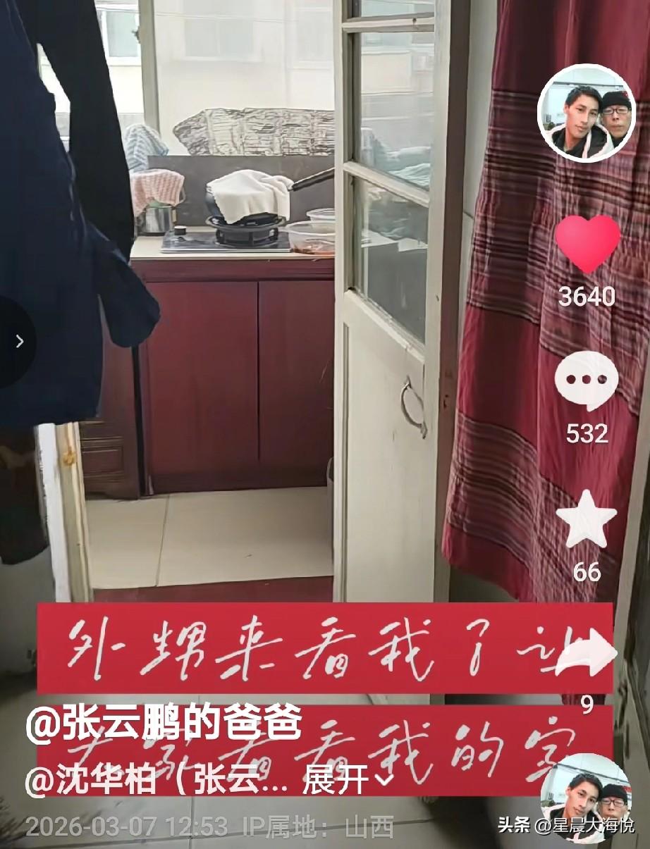 刚刚看到云鹏爸爸更新视频了, 视频里他说,外甥来看他了,还让大家看看他的家, 他的家确实小,一室一厅,但是继母打扫的很干净很整齐, 但是不明白了为啥让大家看看他的家呢?目的何在呢, 不就是在说,他很穷,没有自己的房子吗。 是为了收割挣米吗? 还是为了昨天的那些话呢?云鹏住在他大表哥家…