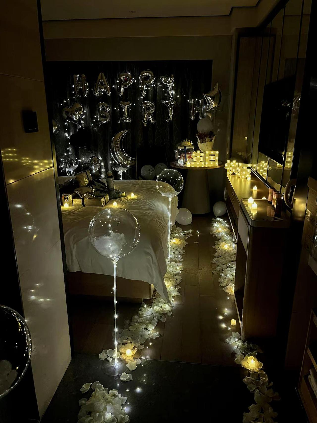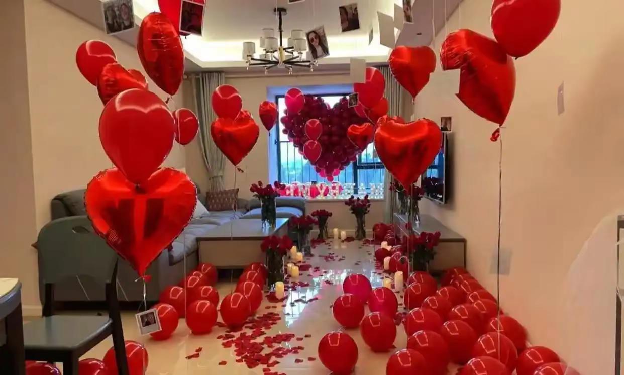 浪漫家居氛围布置指南,做个浪漫的人!。浪漫氛围的家居场景布置,少不了借助一些物品和灯光,分享几样供大家参考。①、气球气球可以拼成多种形状,比如拱门、心形、云朵等。还可以升到天花板上,营造出高底层次,效果特别好!数量可以适合多一些也没问题,但要注意气球的颜色,不要只是单一的红色,最好跟白色搭配,比例可以对半开,也可以白色多点,才不会俗气。②、红色玫瑰花红色玫瑰是布置中的重要物品,可以用花朵,也可以用花瓣。花瓣可以随意散落在地面、台面都可以,用它组成爱心也可以,看个人喜爱。③、蜡烛蜡烛是营造灯光氛围的主要物品。可用蜡烛围成心形图案,浪漫得让人陶醉。蜡烛最好是买偏大些,燃烧时间较长;如果担心安全问题,可以用电子蜡烛。④、星星灯一闪一闪的星星灯,像天上的星星,你说能不浪漫吗?长度最好长些,但不建议围成不同图形。因为随意摆放的星星灯,效果自然,有一种不经意浪漫,可以散落在沙发、地面和茶几上,感觉特别棒!灯光颜色最好选暖白色光,其它颜色的光不建议选,不然就像去了大排档吃夜宵一样。⑤、落日灯落日灯投射出来的灯光柔和、温馨,打在墙上呈现一个圆形,就象一个“蛋黄”。体积小,用来打在墙上,或者一半在墙上一半在其它家具上,营造浪漫温馨氛围非常好!