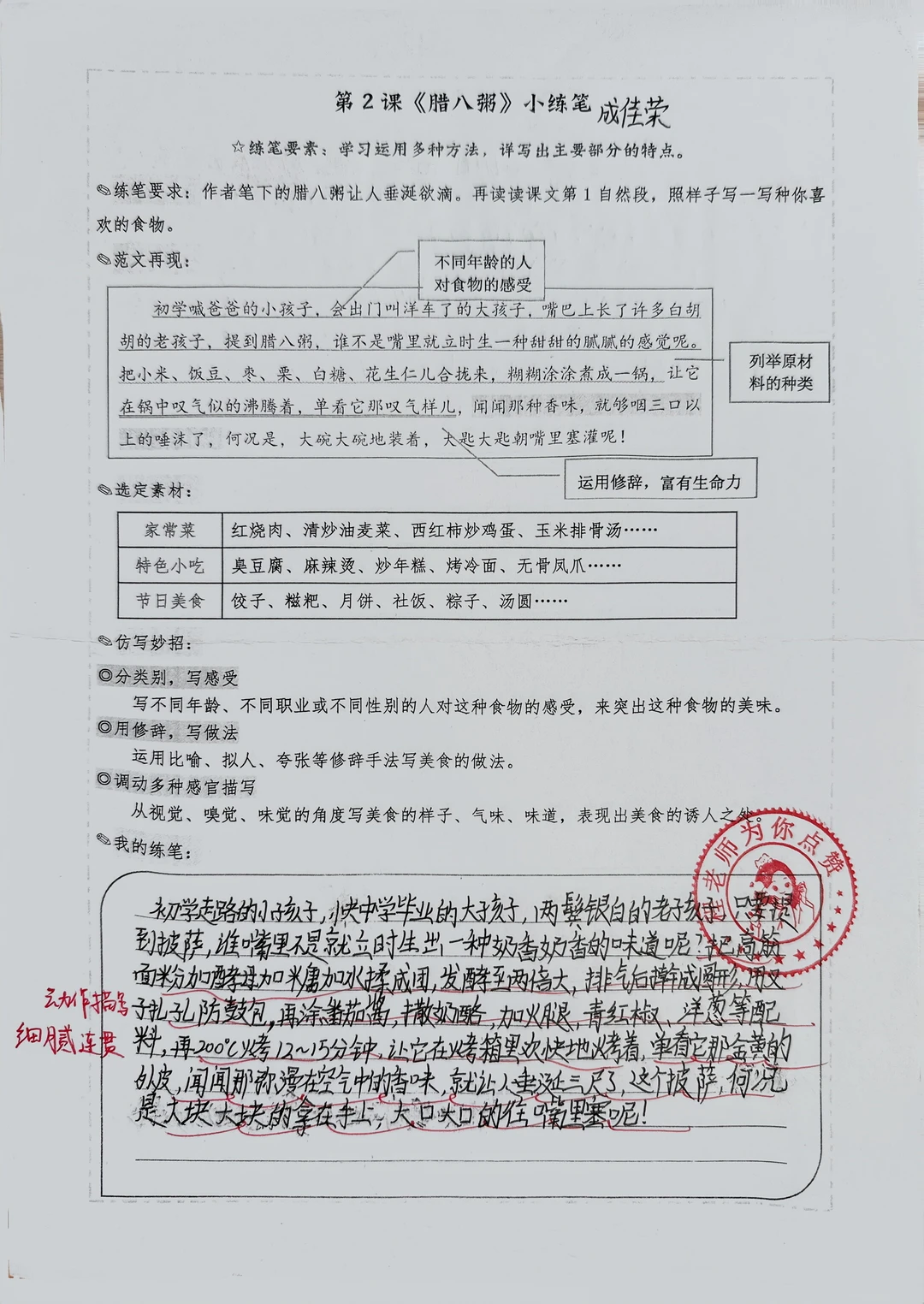 🌟仿写妙招: ①分不同年龄,写感受 👉小孩儿……大孩子……老人…… ②运用修辞手法,写做法 👉比喻、拟人、夸张…… ③调动多种感官描写 👉视觉+嗅觉+听觉 🔸仿写支架: 制作时的样子+烹饪时的声音+出锅后的香气+入口的滋味