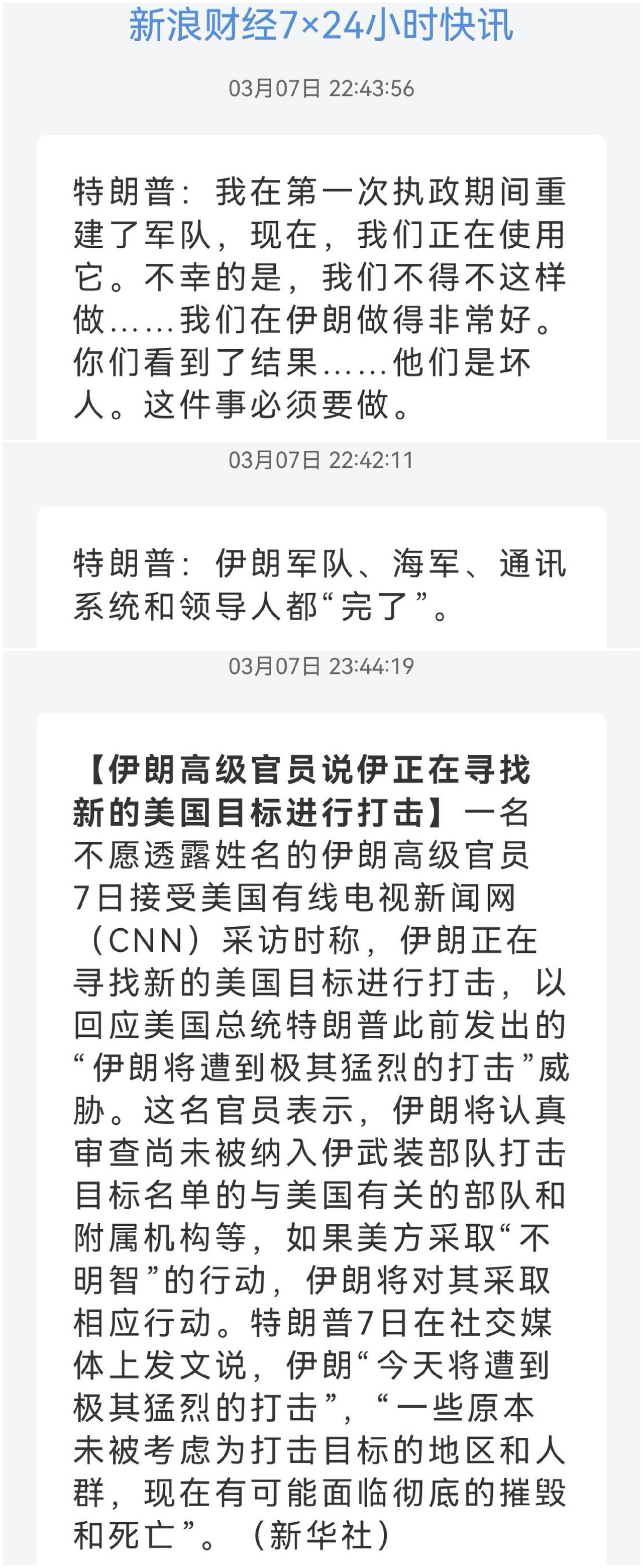 互相进攻继续 伊朗何时服软 如何评价美国对伊朗的军事打击 伊朗的强硬态度能换来和平吗 美伊核博弈 美乙联合军事打击行动继续,乙方按照自己的计划,目标瞄准: 一、防空系统。确保空中走廊畅通,战斗机可以肆意出入地方领空,攻击地面目标。 二、弹道导弹发射场。意图削减发射地点,减少发射数量。 三、导弹储存地下设施。和断取粮道一个道理,没导弹你发射二踢脚吗? 四、作战指挥中心。又是擒贼先擒王策略。 效果如何呢。伊朗倒是继续25、26轮次真实承诺4军事行动,12小时内发射6轮导弹。闪电战、突袭战,变成消耗战,变成双方比拼工业生产能力。美乙方的拦截和攻击消耗完伊朗的报复行动,还是伊朗先消耗完美乙的防御和进攻武器。要知道伊朗可是有自己的工业体系,除非你美乙把他轰回农业国家。 对耗阶段,说什么都是嘴硬。比如特朗普宣称考虑扩大打击范围,伊朗或遭受非常沉重打击。美智库马上测算,美国对伊朗战争每天耗资近9亿美元。如果策略不变,仍是空中作战,那还是消耗战。伊朗马上回复,任何向敌人提供领空和领土的国家都是合法打击目标。伊朗军队已履行承诺,对美国用于入侵伊朗的所有基地都进行了打击。比如部署在海湾各国的萨德系统,三套都已经结束使命了吧,有风闻要把部署在韩国的萨德调向海湾。防御系统出现漏洞,以后的日子会更难受。 特朗普说,我们在伊朗做得非常好。你们看到了结果,他们是坏人。这件事必须要做。伊朗军队、海军、通讯系统和领导人都完了。当然如果你说领导人完了,伊朗承认,如果你说军队完了,那何来的抵抗不断?人家伊朗还在说,正在寻找新的美国目标进行打击呢。委内瑞拉的战事太顺利,蒙蔽了特朗普的双眼。抓走领导人就是胜利,他们不再反抗了。现在呢?波斯即使失去领导人,抵抗依然不断。脑瓜子嗡嗡的吧。 后续如何演变?重归谈判吗?如果现在停战谈判,可能伊朗连铀浓缩都不会停止,因为伊朗觉得他有这个资格,他认为美乙行动失败,他只不过再换一个领导人而已。美乙清楚的很,继续打下去必然。直到打到伊朗先要求谈判为止。要不就是特朗普直接宣布美国已经完成政权更迭目标,美国胜利。毕竟伊朗需要换领导人。 (图片源自网络侵权告知删除)