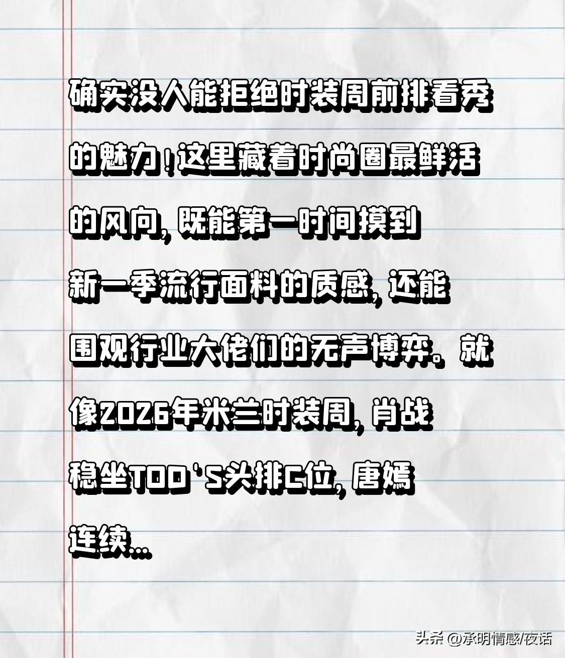 的确,没人能抵御时装周前排看秀的魅力! 这里蕴含着时尚圈最鲜活的风向,能率先感受新一季流行面料的质感,还可旁观行业大佬间的无声较量。如2026年米兰时装周,肖战稳坐TOD'S头排C位,唐嫣连续三年霸占FENDI“铁王座”,座位顺序暗藏明星商业咖位。前排还能近距离邂逅惊喜,扎克伯格与Prada总裁邻座同框,反差感十足。预算不够“真前排”,哈尔滨时装周云看秀也能让你体验潮流现场。 时装周前排宛如时尚界的「名利场缩影」,要为你梳理各品牌头排座次背后的规矩吗?2026时装周 2026年秀场 全维度超感秀场