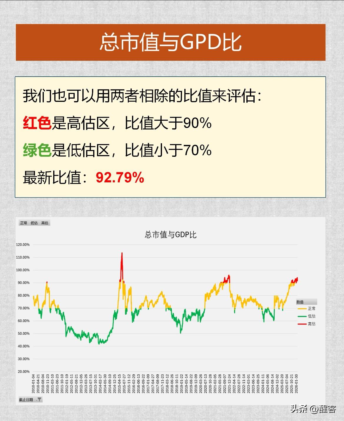 总市值与GDP的对比,目前A股的总市值来看正处于温和高估的区间。 根据A股历史走势与GDP的比例来看,每当A股总市值超过或接近GDP总量都将面临着调整。 但是经验是用来打破的,趋势是无法完全预料的。美国股市的总市值是美国GDP的两倍还要多,美股却一直在涨,这样的比例似乎维持几十年了,为什么美股就没有这样的比例表现呢?