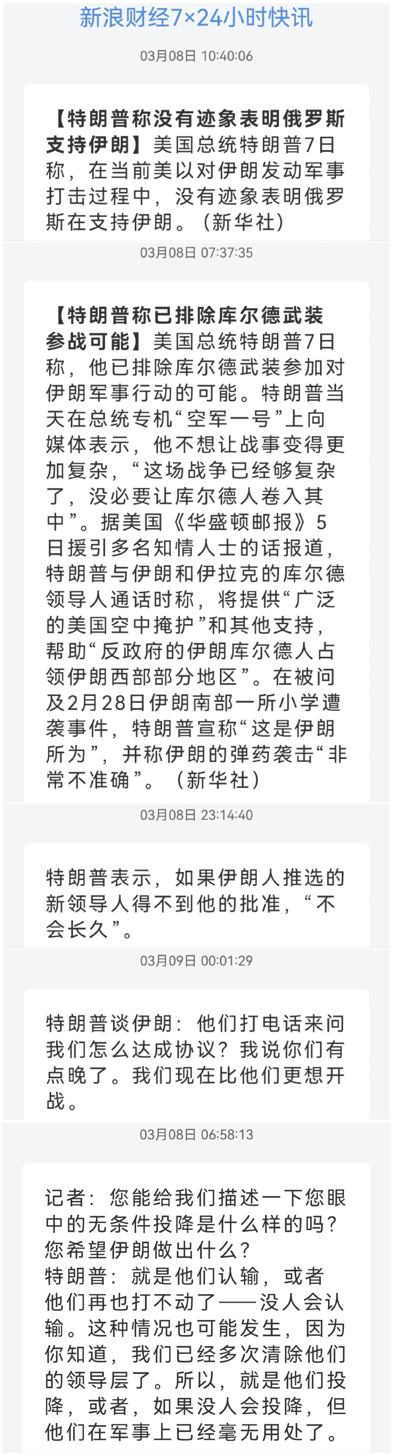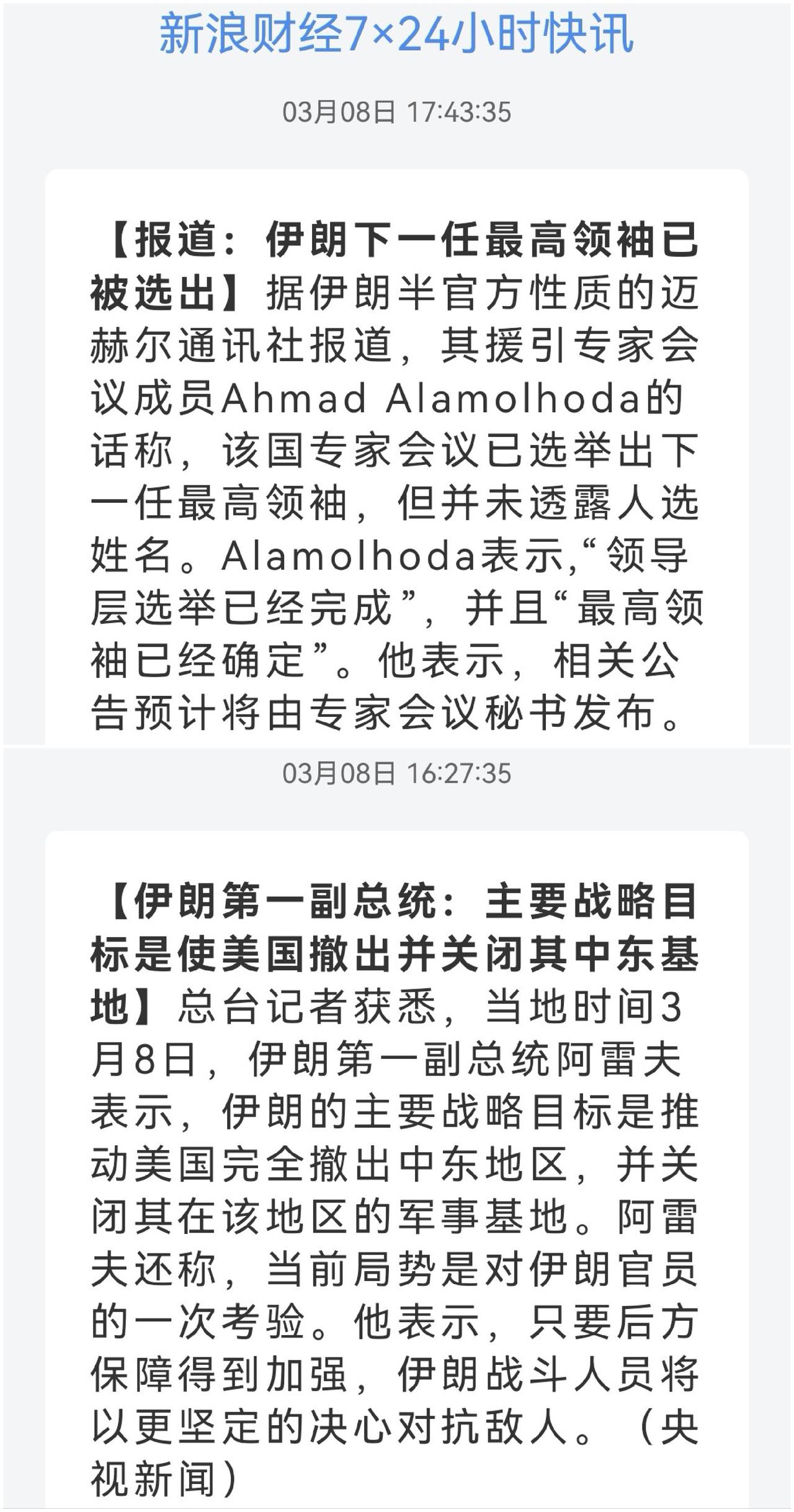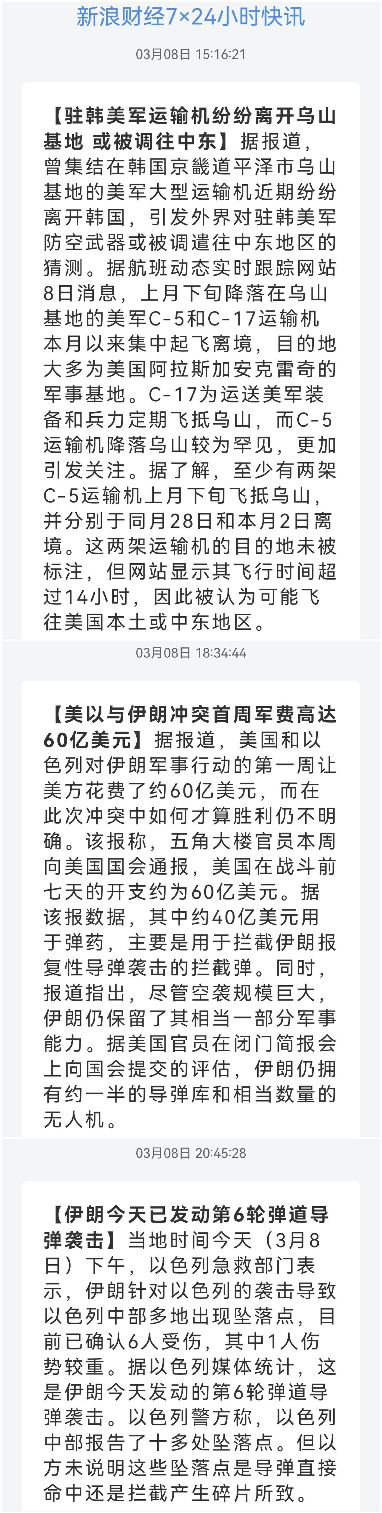 伊朗还能坚持多久 媒体暗示每轮十多处落点 美国对伊朗开战 美伊冲突是否会升级为全面战争 美伊核博弈 美乙对伊朗动武已一周,由于西方针对性媒体封锁,伊朗的反击效果不得而知。只能分析各方动向来猜测背后隐藏的秘密。 第一则消息来自驻韩美军,C5和C17运输机集中起飞离境。C5银河超级运输机,是为了萨德吗,C17是为了运兵吗,侧面证实伊朗说法,中东美军基地被空袭,破坏4套萨德和大批美军兵力。补充装备和援军更可能。美乙首周军费60亿美元,2/3用于拦截,不可否认,高精尖,但库存还剩几何。伊朗还有多大能力呢,看看美方的想法,据美国官员在闭门简报会上向国会提交的评估,伊朗仍拥有约一半的导弹库和相当数量无人机。再生产能力先不说,伊朗的矛和美乙的盾,谁先耗尽。看一组乙方媒体统计,这是伊朗今天发动的第6轮弹道导弹袭击。乙警方称中部报告了十多处坠落点。而当天伊朗发布真实承诺4行动25号公告,也就是这一个公告至少6轮攻击,每次十多处坠落点,给大家想象吧。 特朗普好像少了些踌躇满志,首先称没有迹象表明俄罗斯支持伊朗,作战期间不再四处树敌,这一点做的不错。然后就是排除库尔德武装参战可能,这一点有点给自己找借口,明明就是挖好坑但人家不愿意跳,毕竟伊拉克、土耳其、叙利亚让人家处理帮忙,帮人家建国的承诺早已抛到十万八千里,那还能再骗第四次。谈到伊朗,说自己比伊朗更想开战不想协议;伊朗推选的新领导人必须得到他的批准;问题是开战之后谁后悔了,领导人认可也只是让世人嘲笑而已。再看回答记者问题谈伊朗怎么认输:就是他们认输,或者他们再也打不动了,没人会认输。这种情况也可能发生,因为你知道,我们已经多次清除他们的领导层了。所以,就是他们投降,或者,如果没人会投降,但他们在军事上已经毫无用处了。没人会认输,没人会投降,他自己也知道,打到最后连战略目标都已失去方向。美国的对手们太高兴啦。 伊朗下一任最高领袖已被选出,伊朗半官方性质的迈赫尔通讯社报道,其援引自专家会议成员。只要民族继续屹立,换一任领导人而已,他可不像委内瑞拉。而央视新闻报道,伊朗第一副总统说,伊朗主要战略目标是迫使美国撤出并关闭其中东基地。看起来都是大话,但从另一方面来讲,伊朗已经空袭美国在中东各国的军事基地,基地都已经处于伊朗导弹的射程之内,即使不动手,从风险管理角度,后撤不是不可能滴。或者,美国通过谈判可以迫使伊朗把自己的导弹限制在300公里以内,打不着就可以设立基地,多安全。 (图片源自网络侵权告知删除)