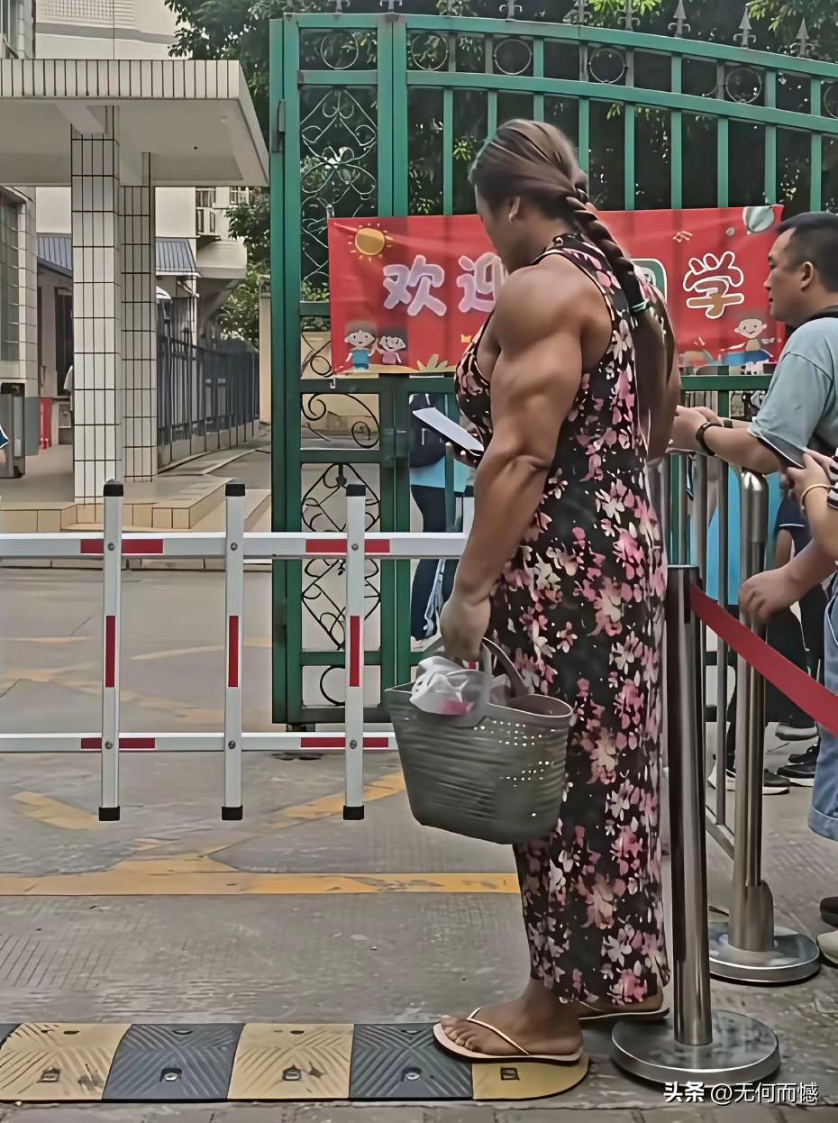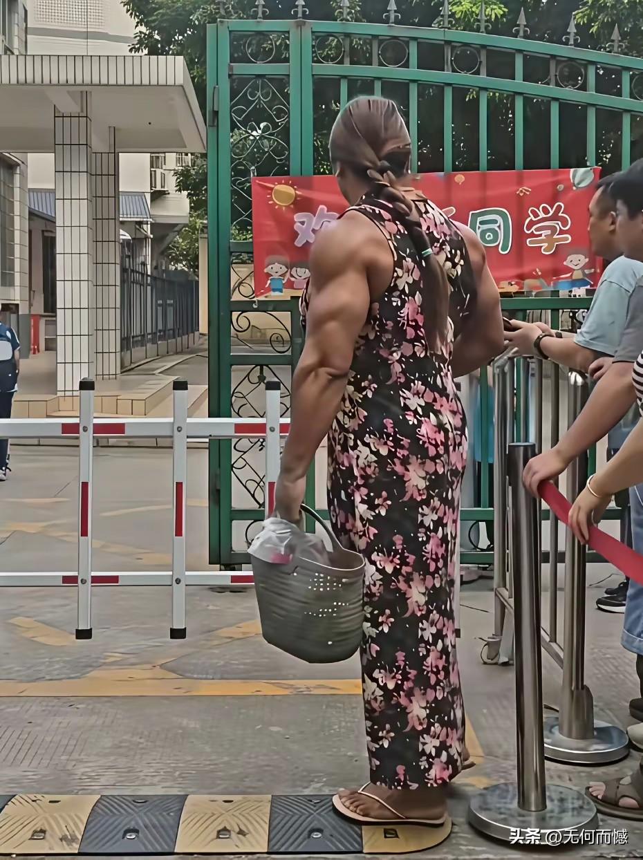 这个在学校门口好像是在等着接孩子的人,是个万里挑一的女汉子,身体长得特别的强壮,特别的结实,这应该是一个健身达人,如果没有经过长期的训练的话,她的胳膊不可能这么粗,肌肉不可能这么发达,看她的身体素质,真是让人羡慕,估计80%的男人,哪怕是经常健身的男人,都未必有这样的身体素质!