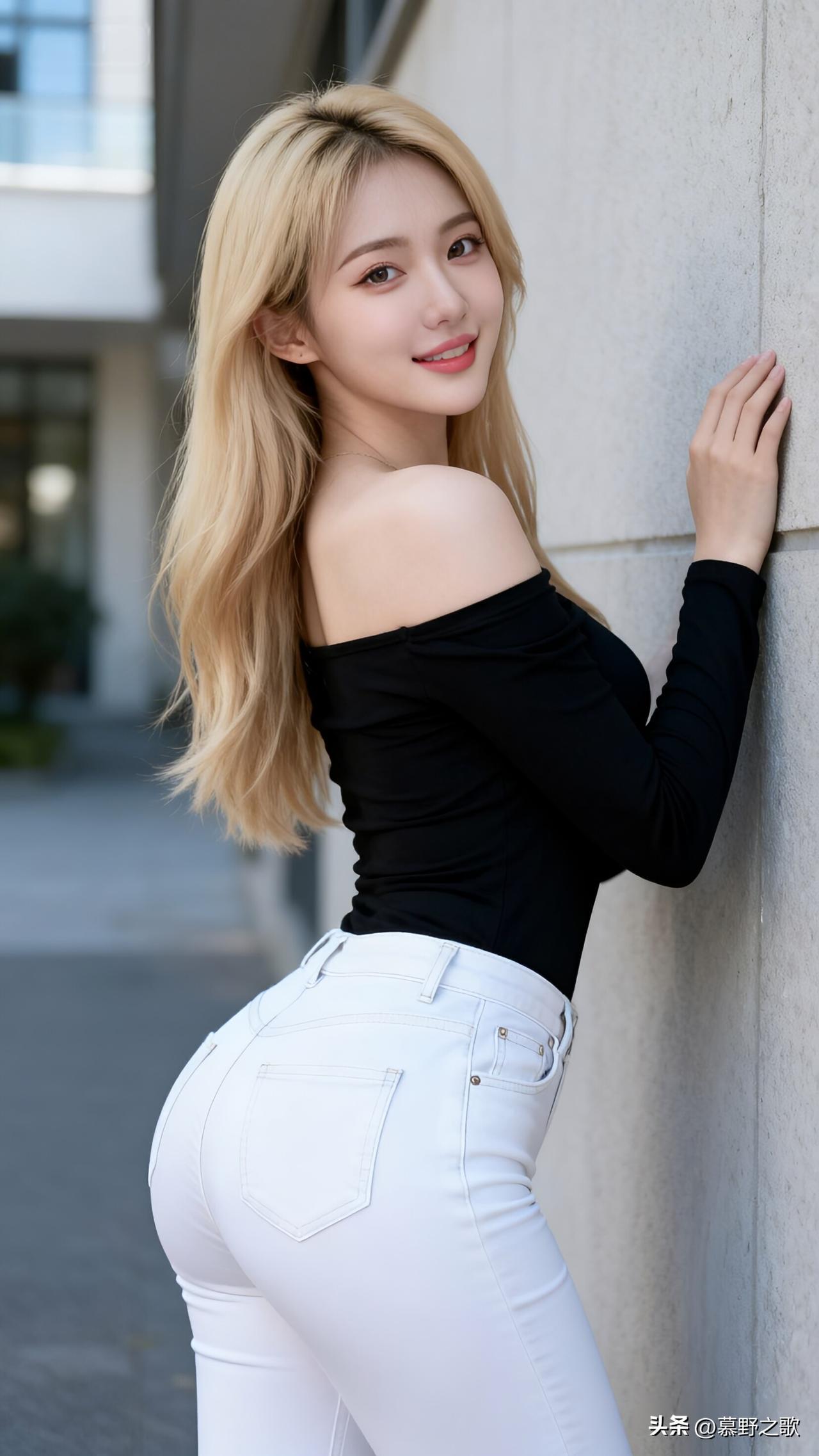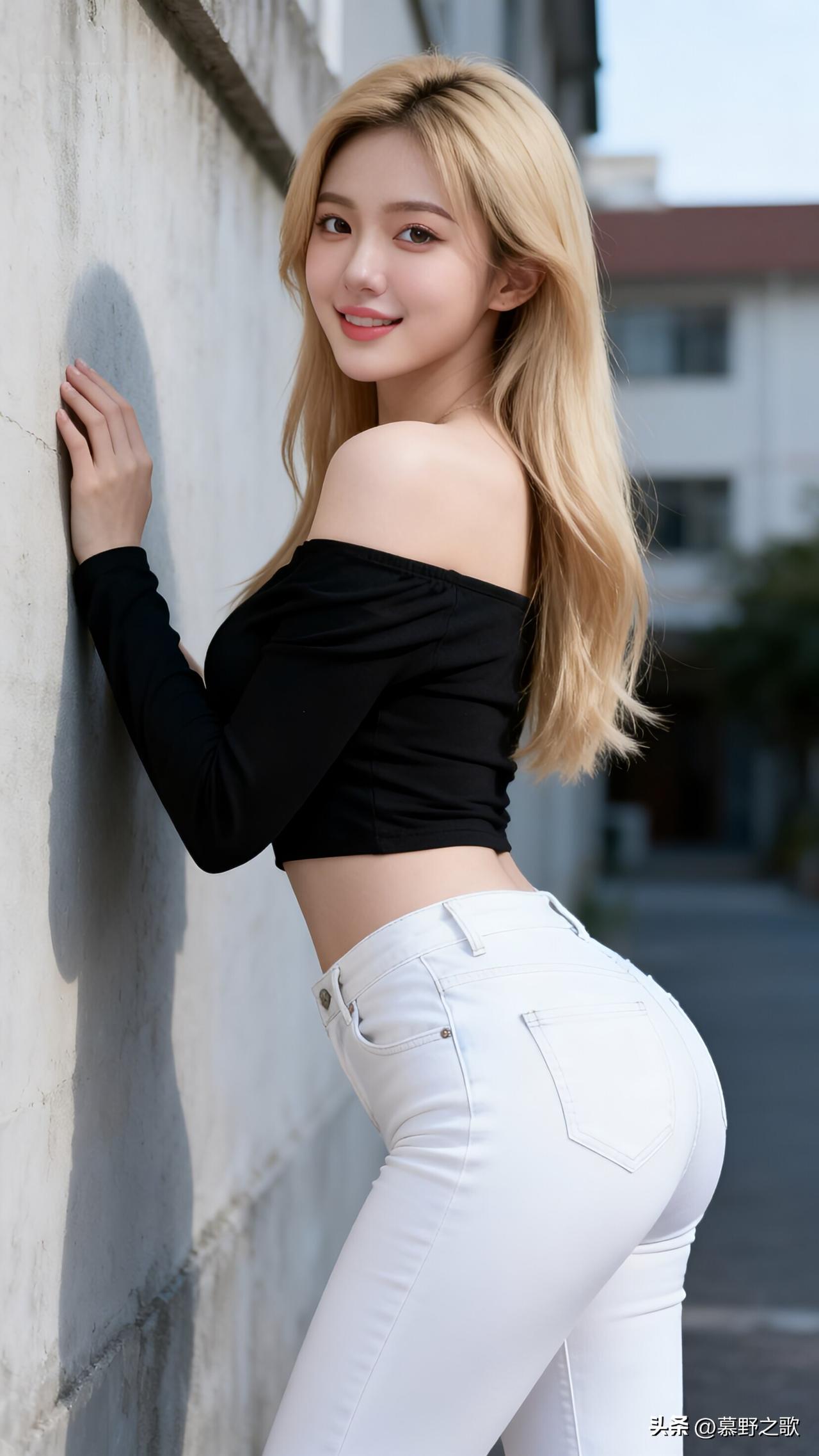 金发飞扬,黑衣白裤,她倚墙回眸,笑容灿烂如盛夏阳光。黑色露肩上衣勾勒出肩颈线条,白色牛仔裤干净利落,金发与黑衣形成强烈对比,视觉冲击力十足。她不是在“摆pose”,而是在享受被阳光亲吻的瞬间。美,是色彩与线条的碰撞,是自信与自由的表达。无论身处何地,都要记得:你值得被阳光照亮,也值得被世界温柔以待。 金发美女 街头时尚风 黑白撞色穿搭 AI人像艺术 阳光系女孩美女人像群