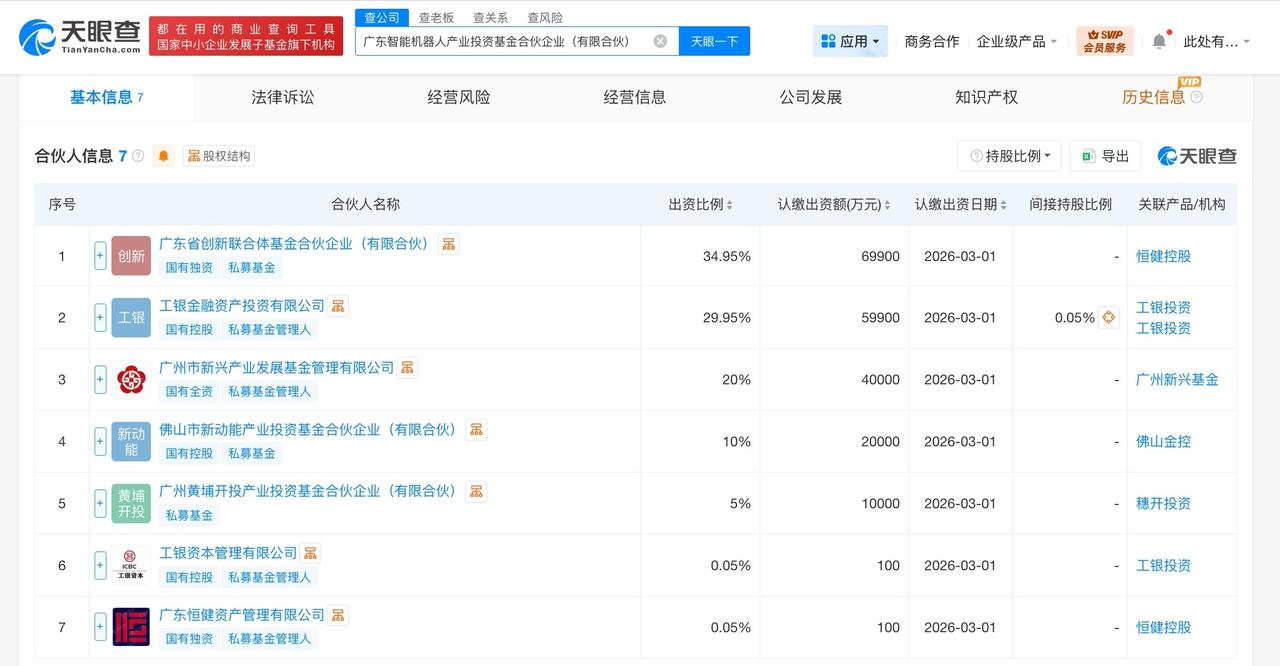 广东智能机器人产业投资基金登记成立 出资额20亿 天眼查工商信息显示,近日,广东智能机器人产业投资基金合伙企业(有限合伙)成立,执行事务合伙人为工银资本管理有限公司、广东恒健资产管理有限公司,出资额20亿人民币,经营范围为以私募基金从事股权投资、投资管理、资产管理等活动。合伙人信息显示,该基金由广东省创新联合体基金合伙企业(有限合伙)、工银金融资产投资有限公司、广州市新兴产业发展基金管理有限公司等共同出资。 天眼查信息: