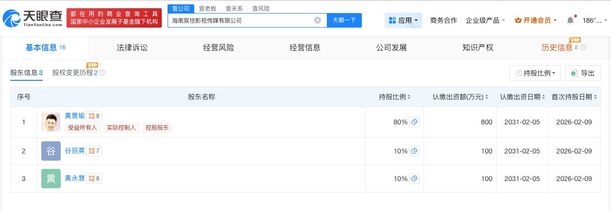 黄景瑜名下公司增资至1000万 黄景瑜名下公司增资 天眼查工商信息显示,近日,海南宸恺影视传媒有限公司发生工商变更,注册资本由500万人民币增至1000万人民币,增幅100%。同时,部分高管发生变更。 该公司成立于今年2月,法定代表人为黄永梅,经营范围包括电影发行、电视剧发行、广播电视节目制作经营、电视剧制作等。股东信息显示,该公司由黄景瑜、谷丽英、黄永慧分别持股80%、10%、10%。 天眼查信息: