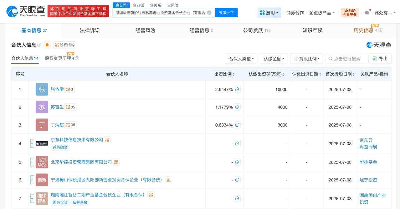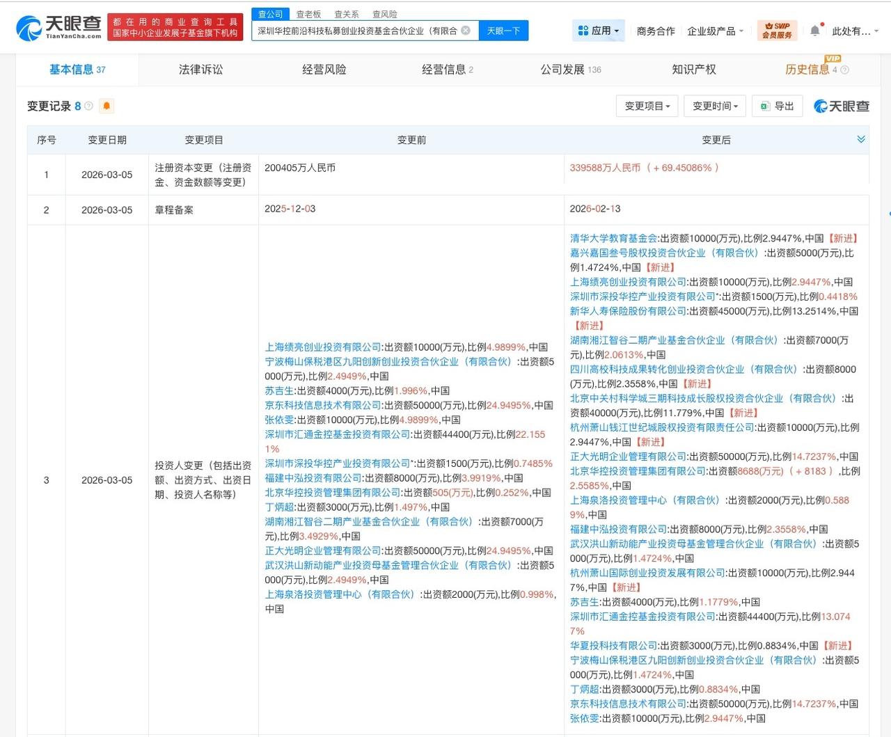 深圳华控前沿科技私募基金增资至34亿 增幅约69% 天眼查工商信息显示,近日,深圳华控前沿科技私募创业投资基金合伙企业(有限合伙)发生工商变更,出资额由约20.04亿人民币增至约33.96亿人民币,增幅约69%,同时新增北京中关村科学城三期科技成长股权投资合伙企业(有限合伙)、杭州萧山国际创业投资发展有限公司、新华人寿保险股份有限公司等8位合伙人。 深圳华控前沿科技私募创业投资基金合伙企业(有限合伙)成立于2025年7月,执行事务合伙人为深圳市深投华控产业投资有限公司,经营范围为以私募基金从事股权投资、投资管理、资产管理等活动。合伙人信息显示,该基金现由京东科技信息技术有限公司、正大光明企业管理有限公司、深圳市汇通金控基金投资有限公司及上述新增合伙人等共同出资。 天眼查信息: