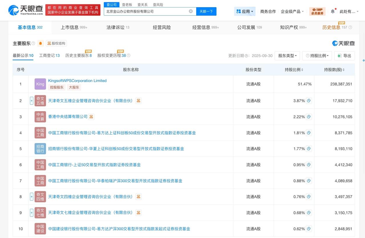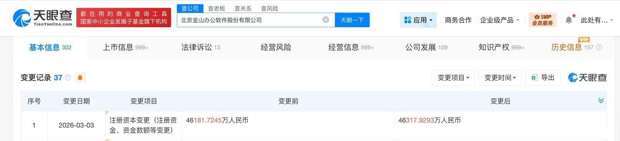 金山办公增资至约4.63亿 天眼查工商信息显示,近日,金山办公(688111)发生工商变更,注册资本由约4.62亿人民币增至约4.63亿人民币。 北京金山办公软件股份有限公司成立于2011年12月,法定代表人为邹涛,经营范围包括开发办公软件、销售自行研发的软件产品、计算机系统集成等。股东信息显示,该公司由KingsoftWPSCorporation Limited、天津奇文五维企业管理咨询合伙企业(有限合伙)、香港中央结算有限公司等共同持股。 天眼查信息: