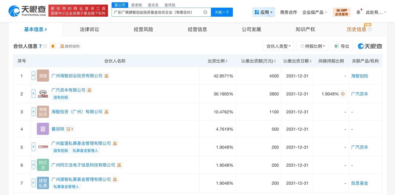 广汽集团等成立新创业投资基金 出资额1.05亿 天眼查工商信息显示,近日,广东广祺建智创业投资基金合伙企业(有限合伙)成立,执行事务合伙人为广州盈蓬私募基金管理有限公司,出资额1.05亿人民币,经营范围为以私募基金从事股权投资、投资管理、资产管理等活动。合伙人信息显示,该基金由广州海智创业投资有限公司、广汽集团(601238)旗下广汽资本有限公司、海智投资(广州)有限公司、广州盈蓬私募基金管理有限公司、广州建智私募基金管理有限公司等共同出资。 天眼查信息: