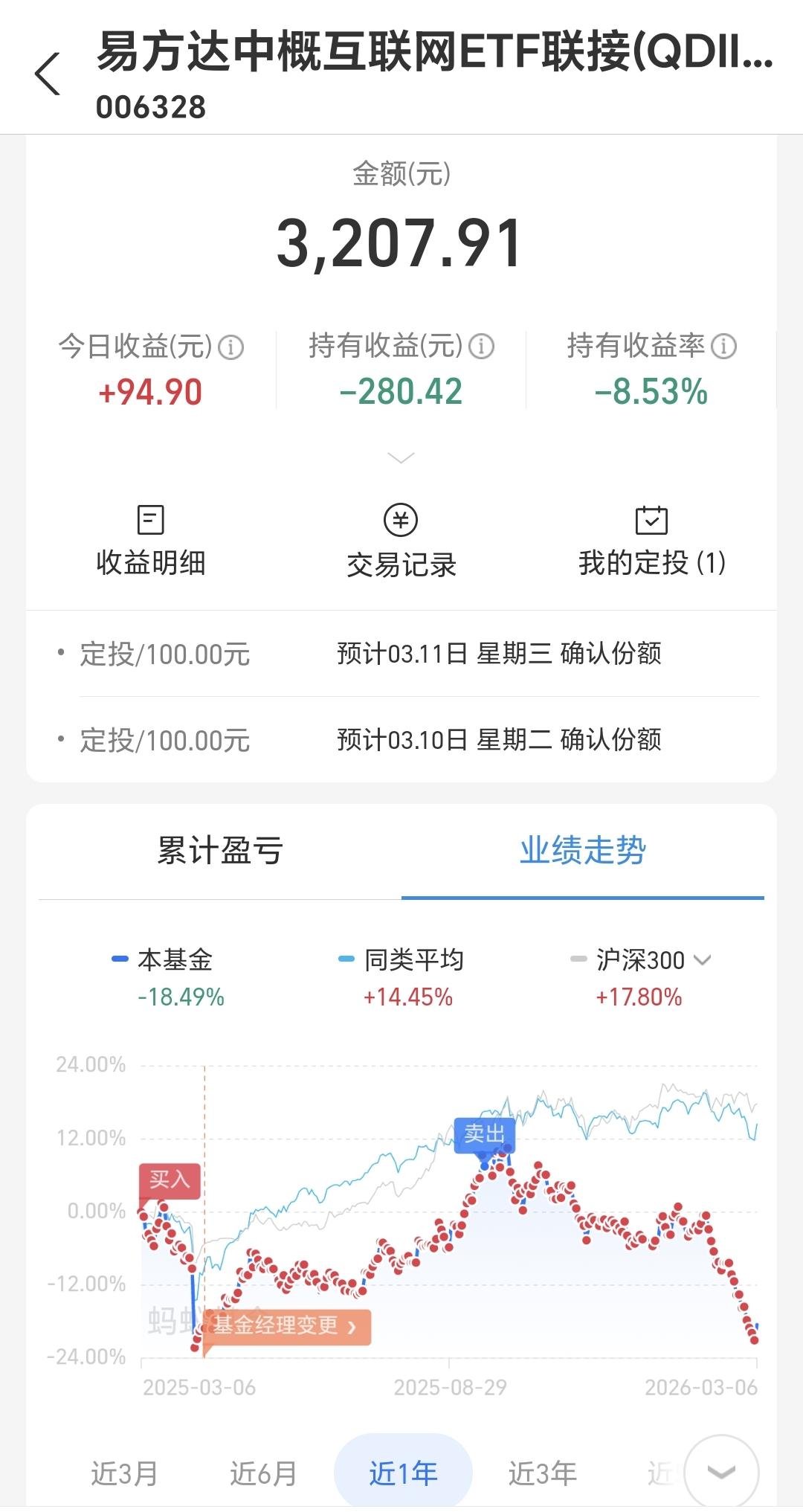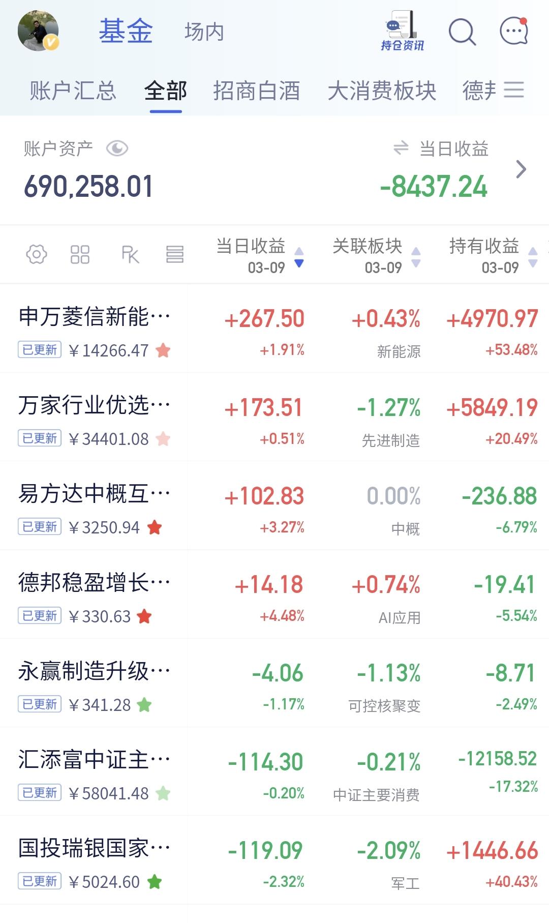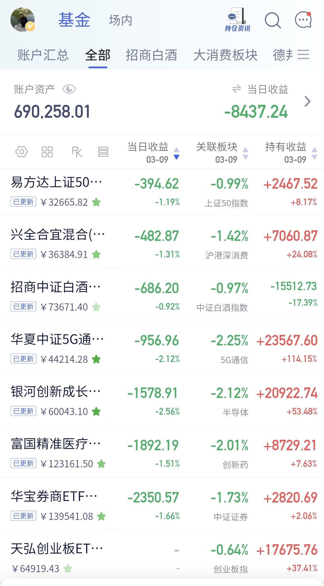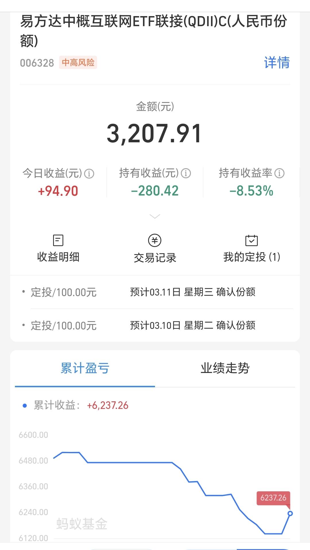 基金:只要有足够的耐心,就能抓住每年的那一、二次机会 欧洲市场现在下跌中,英国下跌了1.17%,德国下跌了1.65%,法国下跌了2.04%,下跌幅度都在1%以上。 香港市场今天也是下跌,恒生指数下跌了1.35%,国企指数下跌了0.54%,恒生科技指数下跌了0.12%。 持有的基金净值大部分已经更新,盈利金额最大的三个板块是:新能源汽车板块,先进制造板块,海外互联网板块,亏损金额最大的三个板块是:证券板块,创新药板块,芯片半导体板块,净值暂时亏损了8437元。 1:券商板块日线级别处于下跌通道中,现在的位置距离下跌通道的下轨线很近,这样的情况下,你可以不进场,但不建议在这样的位置割肉离场,想进场的人需要耐心等待上涨突破这个下跌通道上轨线的时候,再考虑要不要进场。 券商板块周线级别下跌跌破了上涨通道的下轨线,最近的几周都是在上涨通道的下方震荡,想进场的人也是参考日线级别的走势,日线级别出现进场点的时候,再考虑要不要进场。 2:海外互联网板块下跌跌破了日线级别下跌通道的下轨线,处于日线级别下跌趋势中,我把这个板块基金的定投额度,由每天10块钱调整为每天100块钱,在别人都认为不能进场的时候,我在默默的捞取筹码,在别人都认为某个板块是热点板块的时候,我在考虑要不要止盈出来观望。 海外互联网板块跌破周线级别上涨通道下轨线以后,现在形成了一个短期的下跌通道,这个短期下跌通道的时间周期与日线级别的下跌周期差不多,长线持有的人想进场,也是参考日线级别下跌通道的上轨线突破,突破了日线级别下跌通道的上轨线,就可以考虑要不要进场。 中概海外互联网板块基金,我持有3207元,持有亏损280元,持有亏损率8.53%,累计收益6237元,每天定投100块钱。 中概海外互联网板块去年9月18号我也进行了止盈,这只基金我一直持有金额都很小,绝大部分时间都是每天定投10块钱,现在的每天定投100块钱,就是对那一次止盈筹码的回补。 3:固态电池板块日线级别处于上涨通道中,今天盘中大跌的时候,跌破了这个上涨通道的下轨线,收盘的时候又收回到了上涨通道内,又重新回归了日线级别的上涨趋势,短线持有的人可以继续持有,日线级别上涨通道的下轨线是短线持有者的持有条件。 固态电池板块周线级别也处于上涨通道中,现在的位置距离周线级别上涨通道的下轨线比较近,近期观察会不会跌破周线级别上涨通道的下轨线,如果跌破这条下轨线,长线持有的人需要注意风险,只要不跌破这条下轨线,长线持有的人都可以继续持有。 4:低空经济板块日线级别处于短期下跌通道中,这个板块日线级别处于下跌趋势中,想进场的人需要耐心等待上涨突破日线级别短期下跌通道的上轨线,只有上涨突破了这个下跌通道的上轨线,日线级别的短期下跌趋势才有可能被改变。 低空经济板块周线级别处于上涨通道中,这个板块周线级别处于上涨趋势中,长线持有的人可以继续持有,除非周线级别上涨趋势不改变,也就是下跌跌破周线级别上涨通道的下轨线,才可以考虑要不要止盈出来观望。 5:传媒游戏板块前段时间跌破了日线级别上涨通道的下轨线,那个下跌就改变了传媒游戏板块日线级别的上涨趋势,那个下跌的地方是应该短线注意风险的地方,最近一直都是在日线级别上涨通道下方震荡,传媒游戏板块日线级别上涨趋势已经有效破位。 传媒游戏板块周线级别处于上涨通道中,但今天的下跌跌破了周线级别上涨通道的下轨线,是不是有效破位还要等待周五收盘时候确认,如果确认是有效破位,长线持有的人需要注意风险。 6:软件板块也就是AI应用板块,日线级别处于短期下跌通道中,今天的上涨并没有突破日线级别短期下跌通道的上轨线,今天的上涨并没有改变日线级别的短期下跌趋势。想进场的人需要耐心等待上涨突破日线级别短期下跌通道的上轨线,到时候再考虑要不要进场。 软件板块周线级别处于上涨通道中,距离上涨通道的下轨线不远,近期观察会不会跌破这个上涨通道的下轨线,如果有效破位周线级别上涨通道的下轨线,长线持有的人需要注意风险。 7:今天指数探底回升,许多人认为调整已经结束,但我认为调整还没有见到结束的信号,哪怕是明天继续反弹,也不能表明调整已经结束,这个时候最重要的是需要有耐心,足够的耐心也是能力的一种表现,挣钱的事情急不得,心急吃不了热豆腐,耐心等待确定性相对大的机会,耐心等待每年确定性相对大的那一两次机会,我们每年只要抓住一轮的机会就可以了,只要你有足够的耐心,就能抓住那一次机会。 花1秒钟点赞,花30秒钟评论,就是对我最大的支持,谢谢大家的支持。
