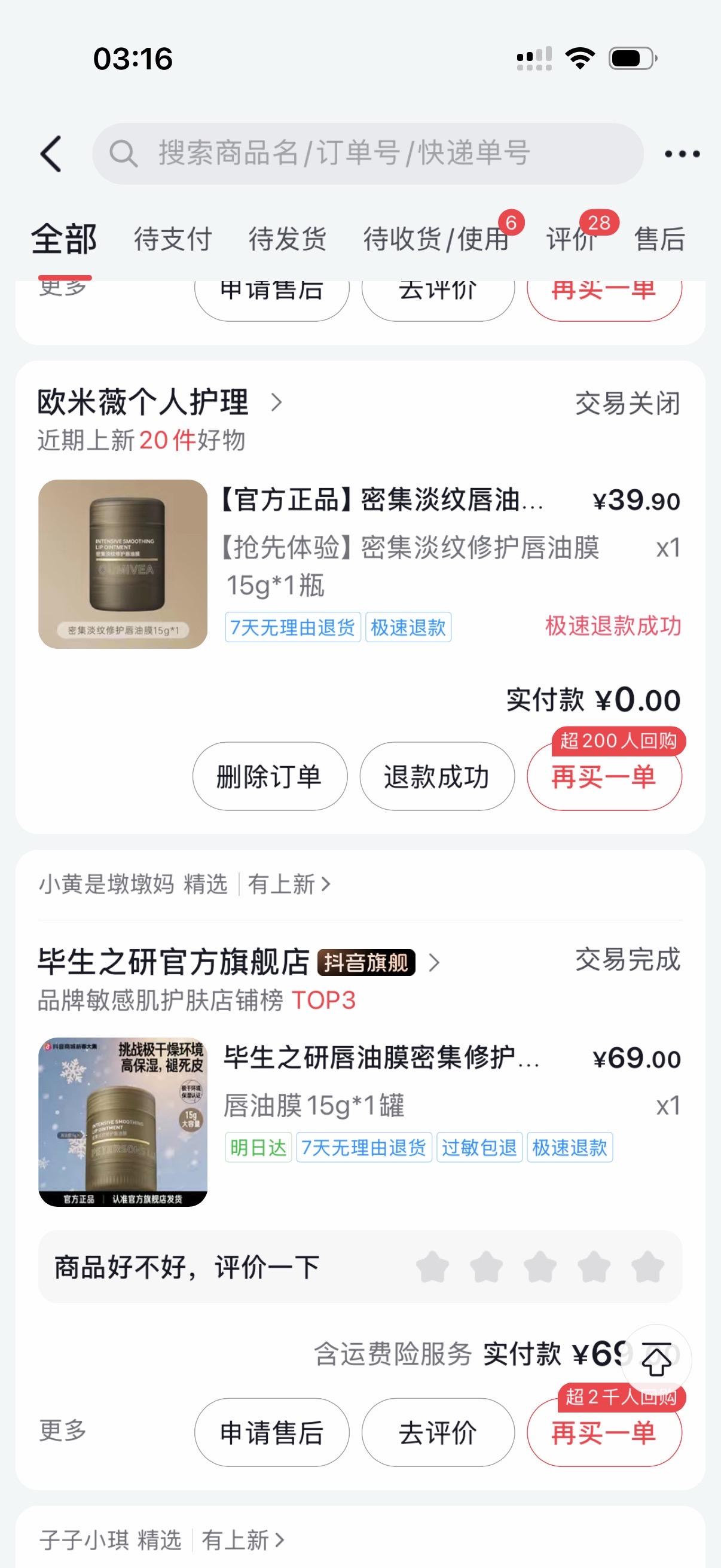 突然想起事情的起因其实是很久之前 我一开始刷到毕生之研的唇膏 我就买了 当时那个视频是话梅推荐的。69 我买了之后 刷两个视频发现话梅又推荐了这个唇膏 更便宜??? 39 我就买了39的我准备去商城把69的退了 结果退的时候 我一看 怎么感觉不一样 仔细一看 还真是字母不一样 完全两模两样。盗版的也没写自己是什么牌子 再回头一看视频 发现是ai的话梅的声音 和视频完全对不上。 !?!? 再有就是之前买的睫毛膏 想买三资堂的 全名叫三资堂 杠铃 睫毛膏。买回来发现是“三资 杠铃 堂睫毛膏 ”另外一个睫毛打底