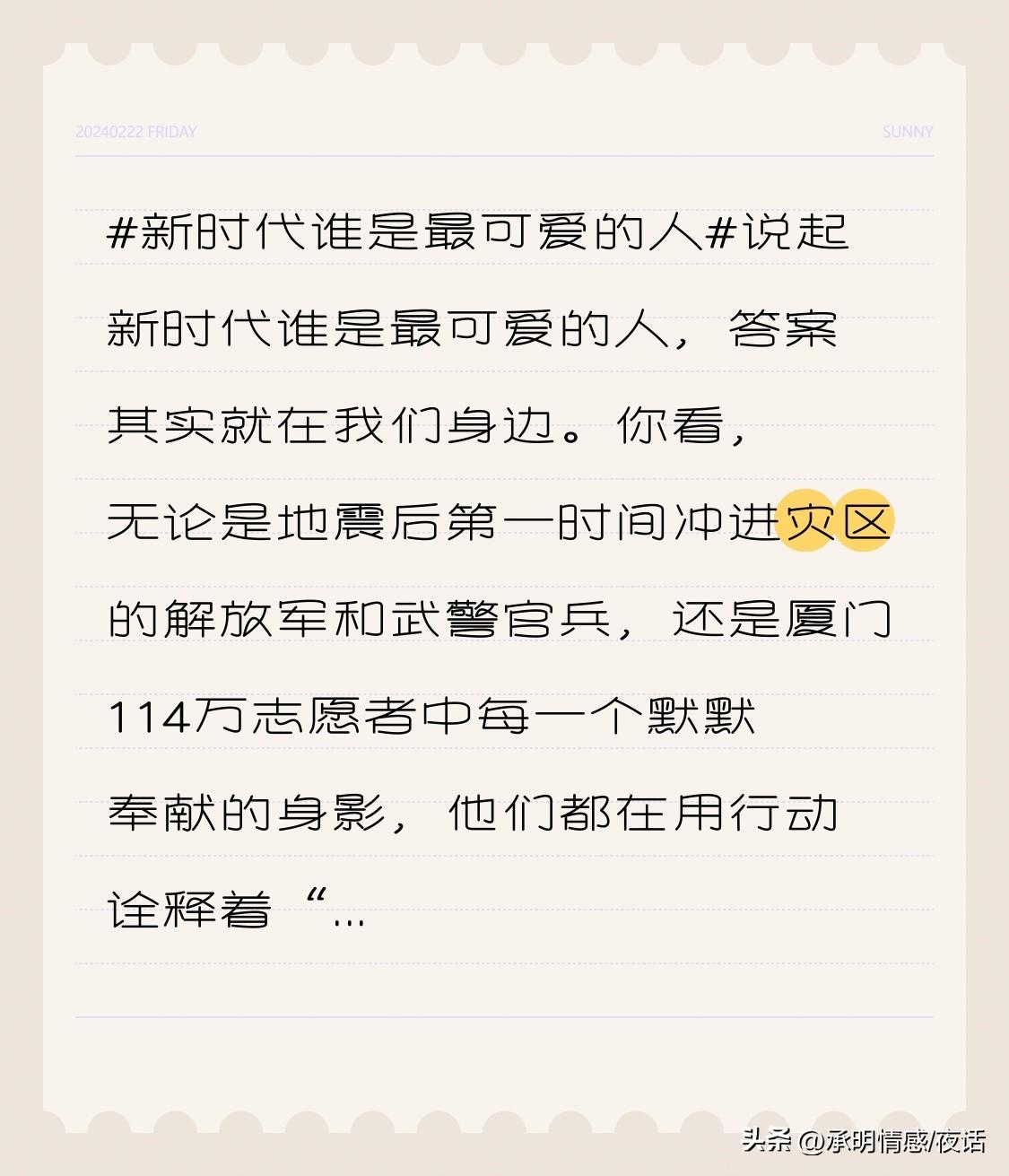 谈及新时代谁是最可爱的人,答案就在身边。瞧,地震后首冲灾区的解放军和武警官兵,厦门114万志愿者中默默奉献者,都在诠释“最可爱的人”新内涵。 如魏巍笔下抗美援朝战士,新时代最可爱的人是心系人民、在平凡岗位书写不凡故事者,像学雷锋日践行“为人民服务”的志愿者。他们无惊天壮举,却以点滴温暖照亮时代。你认为身边谁配此称号?留言说说!