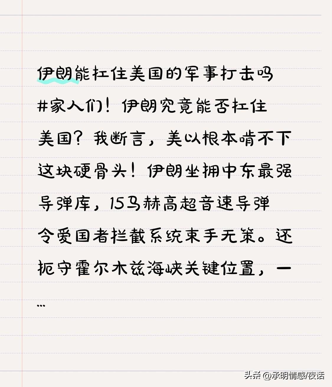 伊朗能扛住美国的军事打击吗 家人们!伊朗究竟能否扛住美国?我断言,美以根本啃不下这块硬骨头! 伊朗坐拥中东最强导弹库,15马赫高超音速导弹令爱国者拦截系统束手无策。还扼守霍尔木兹海峡关键位置,一旦封锁,全球油价必将飙升。其在中东的代理人武装,能将美以拖入战争泥沼。特朗普称战事快结束,恐未洞悉伊朗底气。 伊朗此番强硬对峙,你认为结局如何?点赞收藏,一起交流看法!