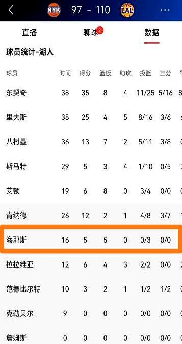 湖人赢球的隐形功臣,全场3投0中。 此前客场刚被尼克斯虐过,这次老詹伤缺,湖人主场全程压着打,110比97完成复仇。 东契奇砍35分8板,里夫斯拿25分,俩人撑住了全队进攻基本盘。 替补中锋海斯打了16分钟,投篮全丢,5分全靠罚球,正负值却高达+8。 他满场跑着补防干扰,抢了3个前场板,还有一次关键抢断直接打乱尼克斯进攻节奏。 赛后采访他半句不提自己进攻拉胯,只说全队防守够拼,就是来报客场的仇。 大家看球总盯着得分数据,可赢球的底气,从来都藏在没人在意的脏活累活里。 你看球的时候,会特意关注这种数据不起眼的角色球员吗?