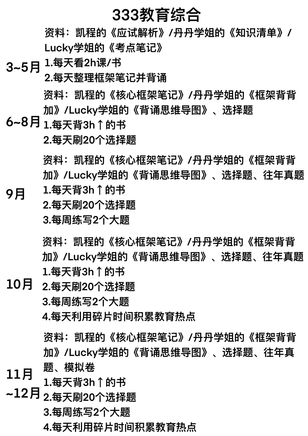 Stella~打基础阶段,可以看课/书自学中教史、外教史、教心和教原;在自学过程中,为了防止大家学一章忘一章,所以每天学完一节,就整理一节的框架笔记并背诵;框架笔记不用太复杂和过于精美,能把大小标题都囊括其中就好了