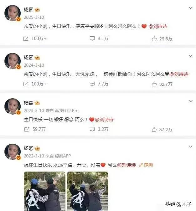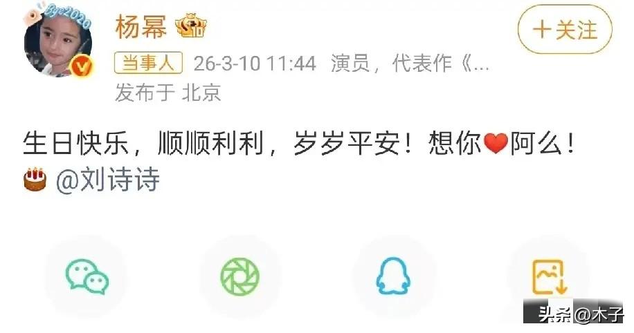 谁能想到,当年闹到形同陌路的杨幂和刘诗诗,如今已经连续五年,准时为对方送上生日祝福了? 3月10日刘诗诗生日,杨幂精准卡点11:44发博,一句“生日快乐,想你阿么”,藏着只有她们懂的专属亲昵。刘诗诗三分钟就赶来回复“阿么~爱你”,熟稔得仿佛那些年的隔阂从未存在。 17年前《仙剑三》,她们是一起从新人闯到顶流的闺蜜,后来却因种种传闻,整整十年几乎零交流,形同陌路。 所有人都以为她们会就此走散,就像内娱无数对走着走着就淡了的闺蜜。可2020年金鸡奖同台破冰后,杨幂每年的生日祝福从未缺席,一送就是整整五年。 看着她们这份兜兜转转找回来的友情,很难不让人想起杨幂和唐嫣那段全网意难平的过往。 谁都记得,2014年杨幂的婚礼,整个娱乐圈她只请了唐嫣一个伴娘。她亲手把捧花塞到唐嫣手里,哭着说要把所有桃花运都给对方,那时候的她们,是连人生第一份喜讯都要第一个分享的人。 可谁也没想到,后来的她们,整整七年几乎零互动,再公开同台时,中间隔着空位,全程没有一次对视,连一句像样的告别都没有,就悄无声息地从彼此的人生里淡去了。 一边是失而复得,连续五年的准时赴约;一边是曾经刻骨铭心,最终却无声走散。 很多人说这是明星的营业客套,可内娱最不缺的就是表面功夫。没人会为了营业,连续五年精准卡点,记得只有彼此懂的昵称,在全网注视下,守着一份曾经走散过的友情。 内娱从来不是没有真友情,只是大多感情,都抵不过时间距离、人生轨迹的分叉。有人走散了还能再找回来,有人却只能留在回忆里。 能失而复得的感情,从来都格外难得。