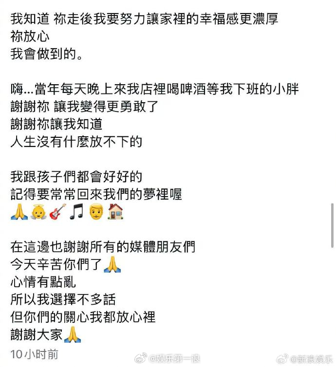 前妻发文告别袁惟仁袁惟仁前妻发长文 10日深夜,陆元琪发长文送别前夫袁惟仁,除了回忆过去的点点滴滴,也坦言在对方离世后,自己内心还没整理好;表示是提起很大的勇气才去送袁惟仁最后一程的,“我想在最后看着、陪着孩子们送你,也让你看见,我真的都放下了”,还称接下来会和孩子们带着曾经的好继续走下去。