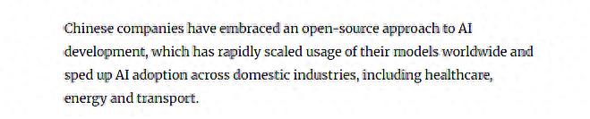 区别于部分国家采取的相对封闭模式,中国选择了一条特色鲜明的开源发展路径。《南华早报》近日报道认为,通过开源策略,中国企业快速扩大了其模型在全球的覆盖范围,并有力推动了AI在医疗、能源、交通等国内各行业的落地应用。这一路径不仅降低了技术使用门槛,也有助于促进全球开发者生态的繁荣。