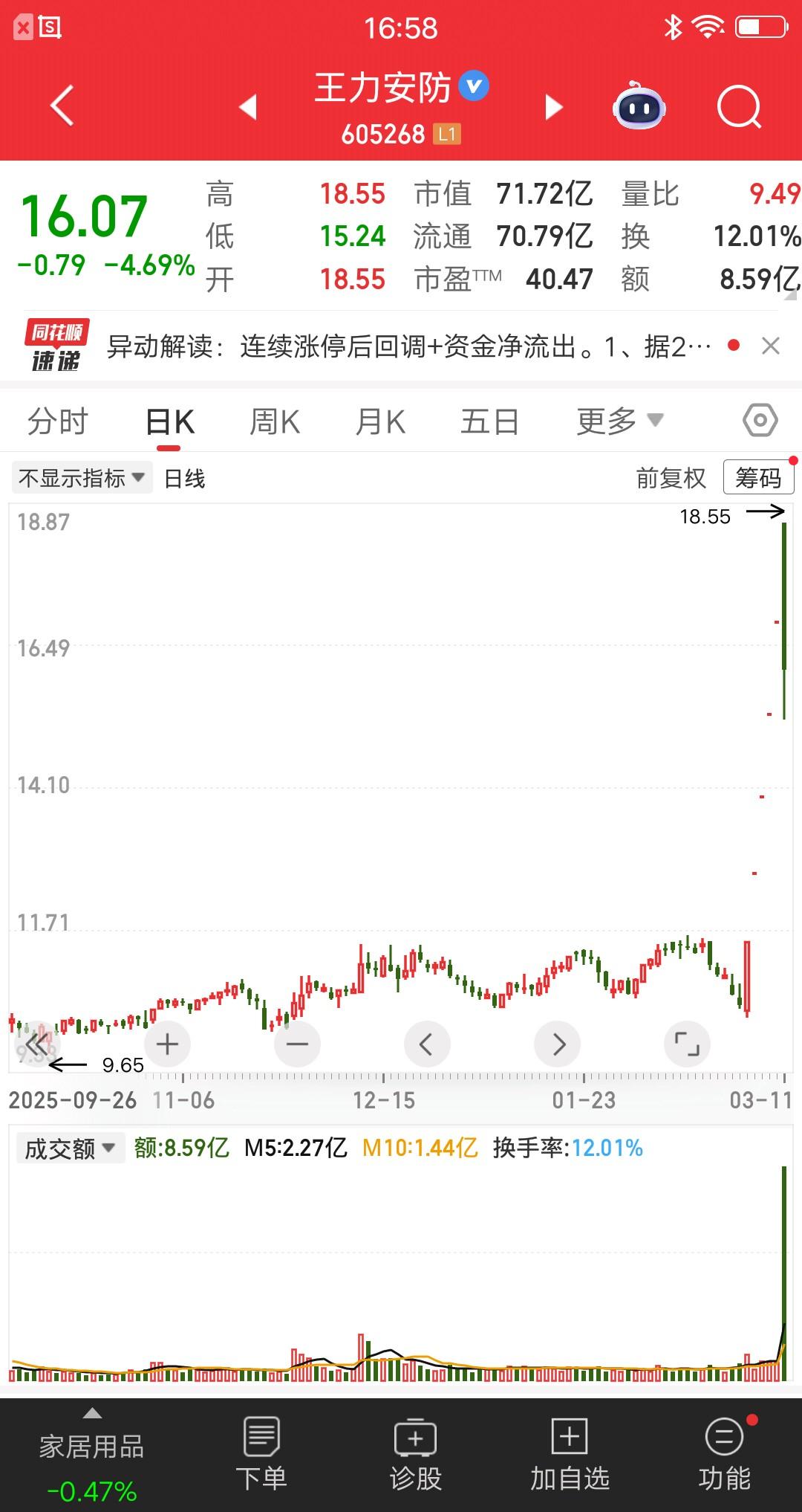 A股今天最惨的票诞生了,三板组的手法依旧非常犀利,打板资金亏麻了。王力安防集合竞价一字涨停,开盘两分钟后炸板,股价自由落体式下跌,收盘跌幅4.69%。主力挺聪明,没有砸出天地板,这样就不会上热搜。 看日线一眼就能看出来猫腻,中间四个缩量一字板,股票又没利好也不是主流题材,杀猪盘的概率非常大。 全天成交额8.59亿,为什么还有这么多散户去买呢?原因很简单,都是贪便宜抄底的。大部分量能,都是在深水区成交的。有的散户奔着地天去的,觉得自己是在低吸。 三板组之所以能长期存活在市场,就是因为新手太多了,总有人去接盘。就算A杀回去也有利润,因为底仓浮盈够大。 吃面的股友,保持乐观心态吧,认真反思。
