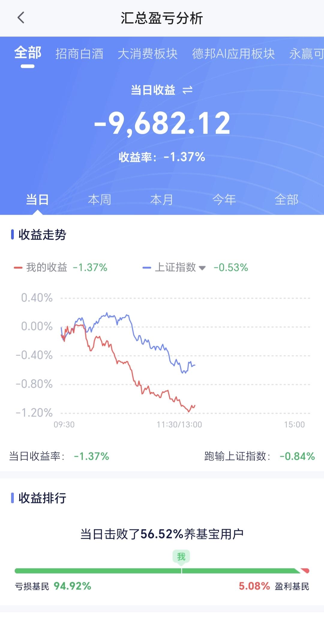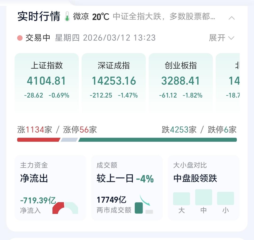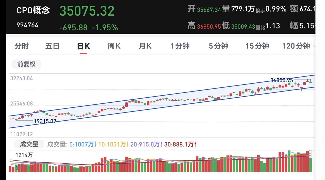 基金:市场指数继续震荡,今天究竟应该怎么办 下午开盘以后小幅度震荡,三大指数都是绿盘,创业板指下跌了1.83%,盘中点位3288点,上证指数下跌了0.72%,盘中点位4103点。 整个股票市场,上涨1134家,下跌4253家,涨停56家,跌停6家,上涨家数少于下跌家数。 持有的基金中,盘中估值盈利的只有新能源汽车板块,估值亏损金额最大的三个板块是:创新药板块,创业板指,5G板块,估值整体亏损了9682元。 整个基金市场,上涨2205家,下跌13744家,上涨幅度超过5%的2家,没有下跌幅度超过5%的基金。 图10是今天板块的上涨排行榜,上涨幅度最大的三个板块是:煤炭板块,电力板块,农林牧渔板块,图11是今天板块的下跌排行榜,下跌幅度最大的三个板块是:可控核聚变板块,cpo板块,通信板块,图12是今天基金的加仓和减仓人数,加仓7564999人,减仓2963389人,加仓人数超过了减仓人数。 整个市场主力资金净流入最多的三个板块是:化工板块,基础化工板块,煤炭板块,主力资金净流出最多的三个板块是:高端制造板块,国企板块,蓝筹策略板块。 1:现在黄色线在蓝色线下方,两条线之间的敞口并不是很大,继续观察两条线位置会不会有变化。 2:两市累计成交17749亿,相比于昨天同期缩量了4%,这个数量你可以理解为卖盘枯竭,你也可以理解为没有资金进场,我认为盘中细节为下跌的时候放量,上涨的时候缩量,资金不愿意进场的可能性更大一些。 3:现在的五天线位置为4116点,盘中点位4104点,是在五天线之下的震荡,收盘的时候观察能不能收到五天线之上。 4:CPO板块今天下跌幅度比较大,现在盘中估值下跌了2.86%,是连续第二个交易日下跌,持有人数在所有板块当中排名第二位。 Cpo板块日线级别和周线级别都处于上涨通道中,今天的下跌并没有能够改变这两个级别的上涨趋势,持有的人可以继续持有,日线级别上涨通道的下轨线是短线持有者的持有条件,周线级别上涨通道的下轨线是长线持有者的持有条件。 5:电网设备板块现在盘中估值下跌了2.43%,是连续第二天下跌,持有人数在所有板块当中排名第五位。 电网设备板块日线级别和周线级别都处于上涨通道中,今天的下跌并没有改变这个板块日线级别和周线级别的上涨趋势,只要这两个级别的上涨趋势不被改变,短线持有的人和长线持有的人都可以继续持有。 6:稀土养殖板块现在盘中估值下跌了2.32%,是连续第二个交易日下跌,持有人数在所有板块当中排名第四位。 稀土永磁板块日线级别处于上涨通道中,距离上涨通道的下轨线比较近,近期观察会不会跌破这个上涨通道的下轨线,如果有效破位这个上涨通道的下轨线,短线持有的人需要注意风险。 稀土永磁板块周线级别处于上涨通道中,距离上涨通道的上下轨都比较远,小幅度的涨跌都改变不了这个板块周线级别的上涨趋势,长线持有的人可以继续持有,周线级别上涨通道的下轨线是长线持有者的持有条件,只要不跌破这个上涨通道的下轨线,长线持有的人都可以继续持有。 今天下午的支撑位置是4080点,压力位置是4125点,只要保持在这两个点位之间,就是震荡走势,今天究竟应该怎么办?我会在评论区留言。 花1秒钟点赞,花30秒钟评论,就是对我最大的支持,谢谢大家的支持。