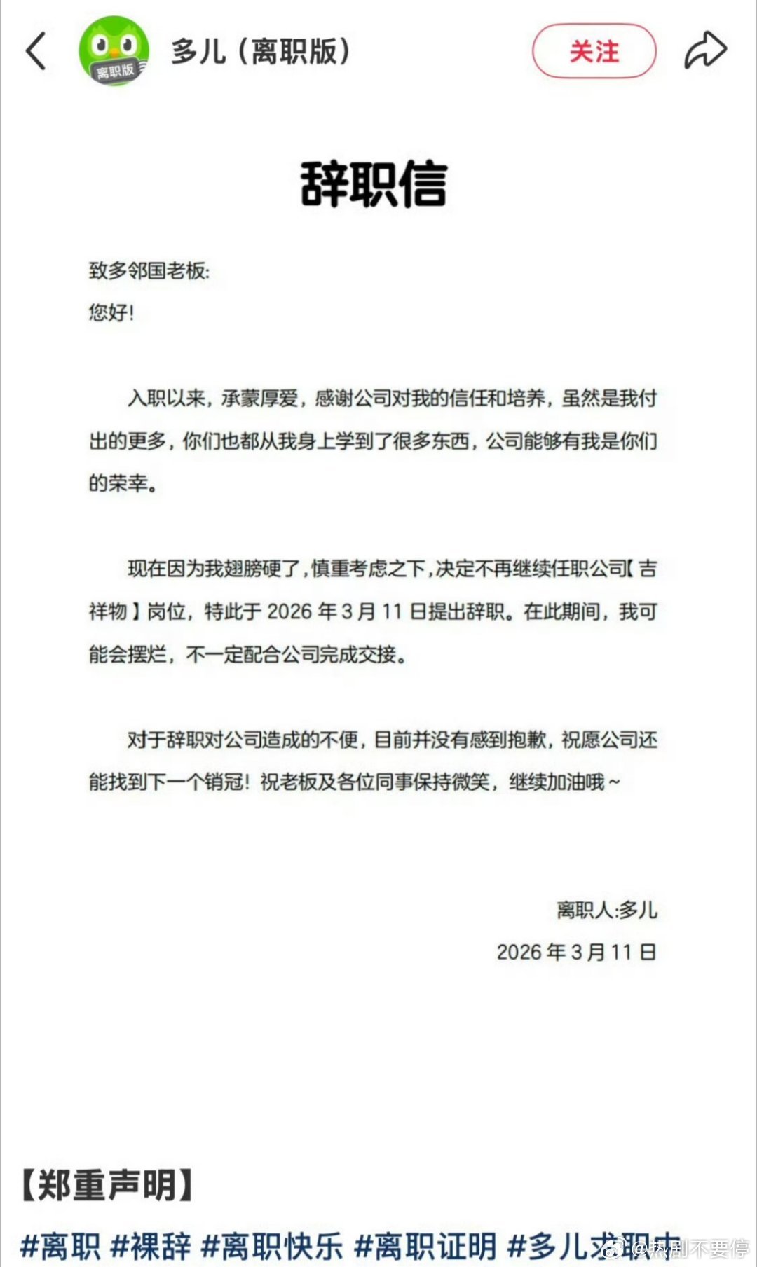 多儿:solo+1多邻国绿鸟 离职