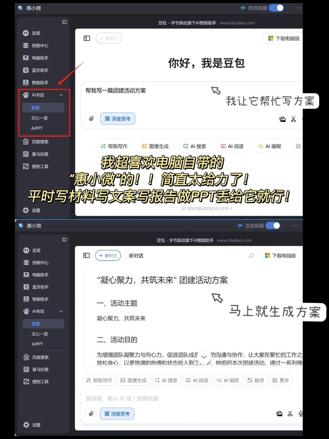 4.惠小微5.1 AI小秘书,化身“智慧大脑”。超级友好,要写啥文案直接丢给它!!比如我平时为了要保持日更,有很多模版化的工作就直接让小微帮我解决,比如写一份团建活动方案、年中总结PPT,我就会直接询问小微,TA能精准理解你的需求,然后自动把任务匹配给豆包、WPS AI 、文心一言等最合适的AI工具!大大提高效率,节省时间!