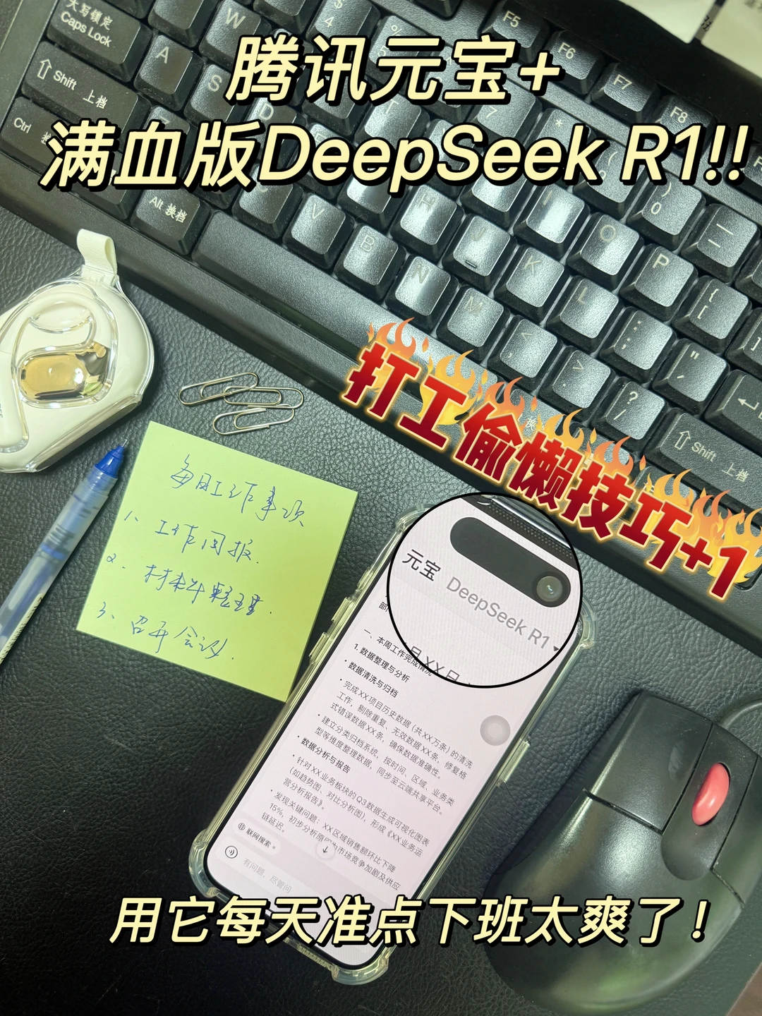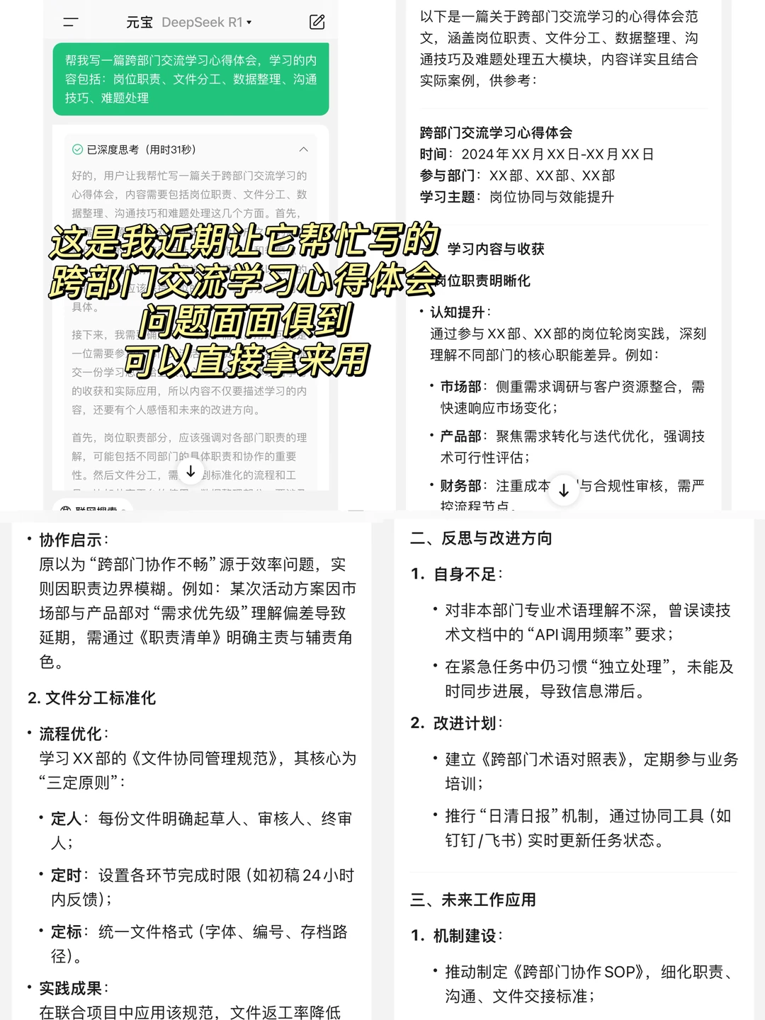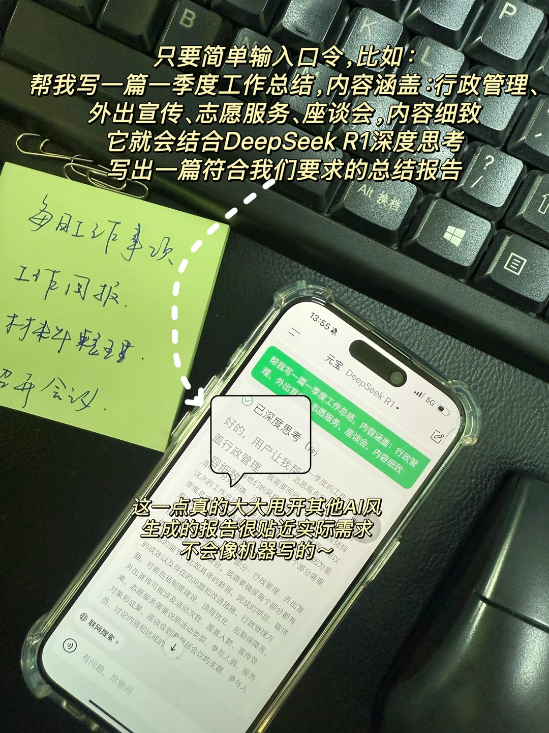 🔸方法很简单:输入简单的需求,记住,一定要选择“DeepSeek R1”,比如:“帮我写一篇工作周报,内容涵盖数据整理、基层调研、召开会议,尽量全面”,大家尽量选择“深度思考”,因为形成的结果会摆脱机器人风格,更像我们日常真实的写作风格。