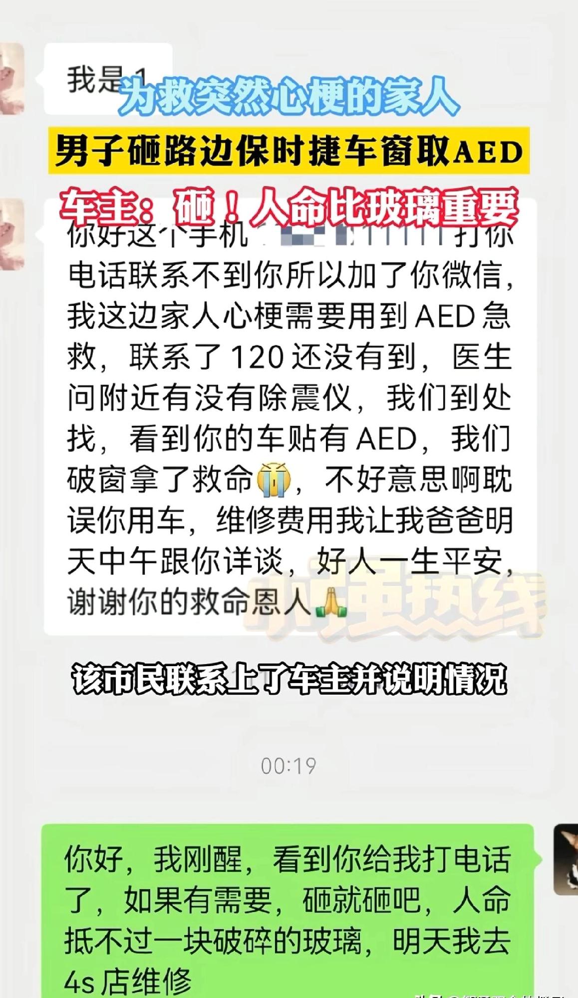 被感动到了!山东威海,男子母亲在家看电视时突发心梗,男子拨打120,医生让他先找AED急救,可家里和邻居都没有机器,危急时刻,男子发现小区停车场一辆保时捷上贴有AED标志。 危急关头,他瞥见小区停车场里,一辆保时捷车身上贴着AED标识,多次联系车主无果,他咬咬牙,砸破车窗取出设备,及时为母亲实施了急救。 经过紧急抢救,老人最终脱离了生命危险,事后男子主动联系车主,提出承担全部修车费用,却被对方一口婉拒。 车主是当地一名建材商人,上月刷视频了解到AED的重要性,特意自掏腰包购置一台放在车上,就是为了以备不时之需,这次能真的救下一条命,他比谁都开心。 AED全称自动体外除颤器,是能让非专业人员也能操作的心脏急救设备,医学数据显示,它与心肺复苏配合使用,能大幅提升心源性猝死患者的生存率。 国内每年因心脏性猝死离世的人数超五十万,可目前AED的普及程度仍远远不足,不少城市的公共场所,难觅其踪影,很多人甚至不知道它的存在。 像深圳这样的先行城市,已在公共场所大量配置AED,也曾多次出现设备救人的案例,但在更多地方,AED还是稀缺资源,没能像灭火器一样成为标配。 这场意外里,我们看到的不只是母子情深,更是陌生人之间的善意传递,车主的豁达,打破了“豪车车主”的刻板印象,用行动诠释了什么叫格局。 可欣慰之余,也该看清现实:若当时小区里没有这辆备着AED的车,后果不堪设想,AED的普及,绝不能只依赖个别热心人的自觉,更需要社会层面的重视与推进。 有网友点赞“救命要紧!男子砸车救人太敢了,车主这心也太善了吧”,这份双向的善意,着实暖到了不少人。 男子的果断、车主的大度,共同谱写了一段暖心佳话,可转念一想,若当时小区里没有这辆备着AED的车,结局又会如何? 在我看来,这事儿不止是暖心,更是给所有人提了个醒,咱普通人得多学点急救知识,社区也该多配点AED,关键时刻真能救命,车主的做法值得点赞,但更希望这样的“幸运”能变成常态。 这事你怎么看?
