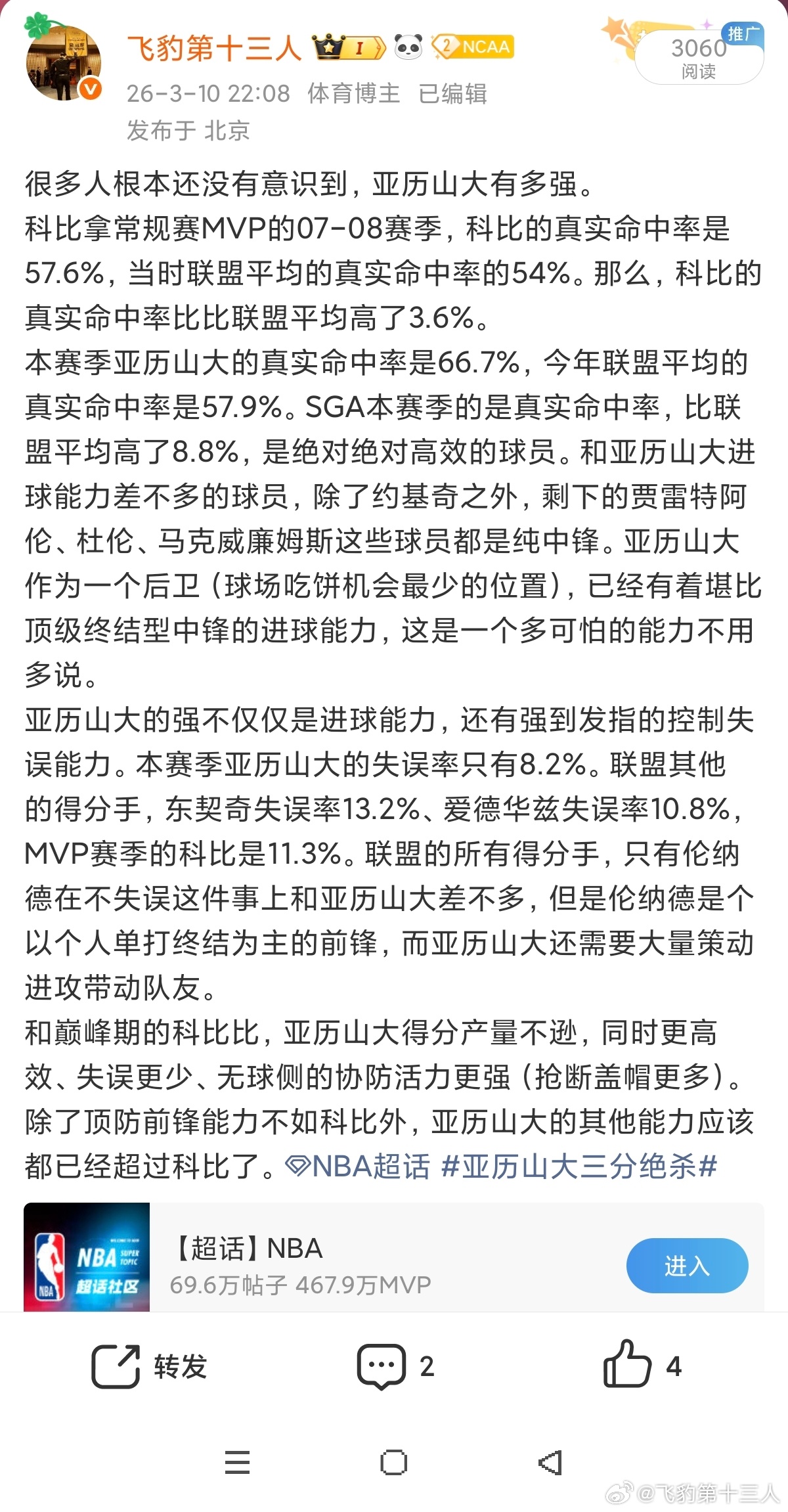 一场104比102的比赛,这个比分应该是有些古董老球迷喜欢的。亚历山大在这样一场低比分比赛中依然高效砍下35分9助攻,投篮命中率72%,三分命中率40%。亚历山大现在的得分能力就是远超科比,科比一个赛季都打不出一场70投篮命中率的比赛。去掉时代影响因素的话,亚历山大每百回合得分超过06科比,助攻也超过06科比,效率更是吊打06科比。更何况06年本来就是因为改规则,造成大量球星数据爆发。科比在06年的数据,并不优于当赛季20岁的詹姆斯和已经大幅度下滑的艾佛森,本身那年的数据水分就很大。现在的联盟第一人亚历山大比科比厉害根本没什么惊奇的,亚历山大都比约基奇了,比科比强不是很轻松的事情。科比不是历史最被高估的球员,起码也是历史最被高估的球员之一。公牛vs湖人雷霆vs凯尔特人霍姆格伦罚球绝杀凯尔特人