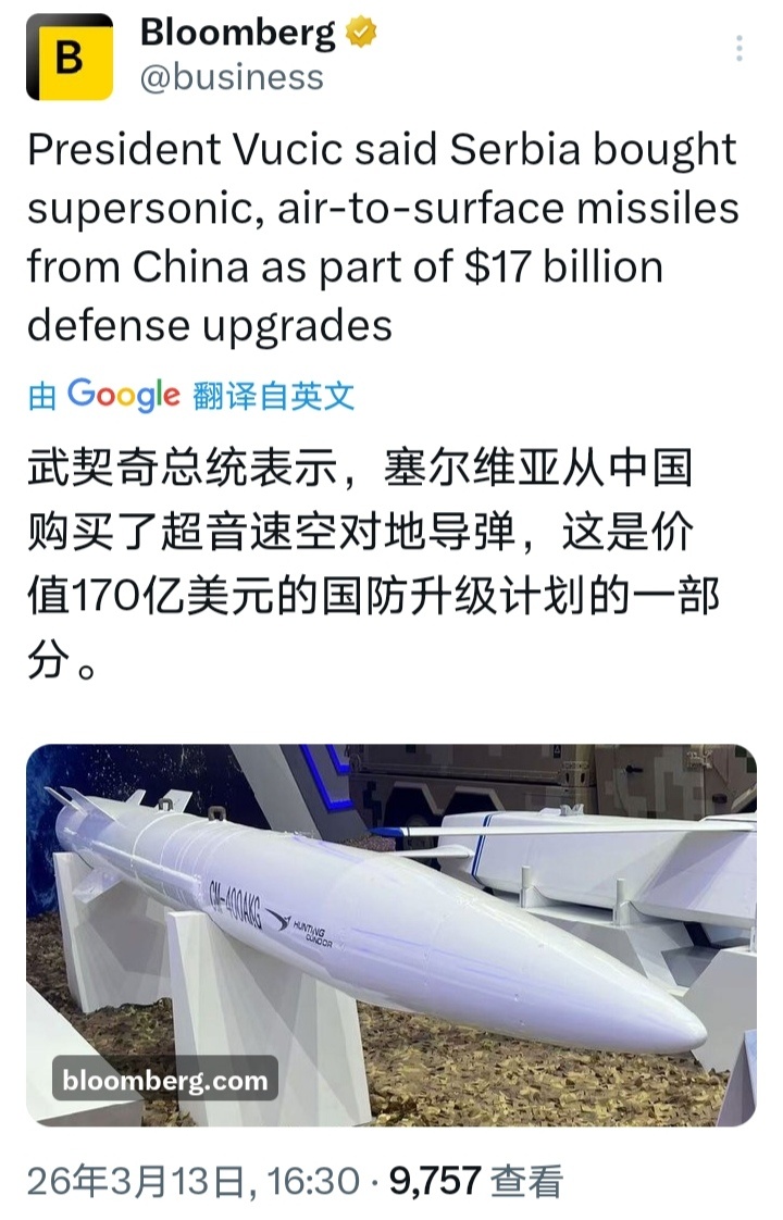 彭博社:塞尔维亚总统武契奇表示,塞尔维亚从中国购买了CM400AKG超音速空对地导弹,这是价值170亿美元的国防升级计划的一部分,旨在应对邻近北约国家的敌对意图。