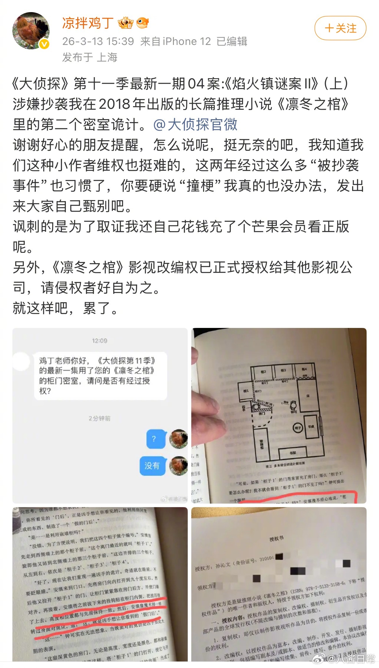 一位推理作家发文表示《大侦探》第十一季最新一期04案《焰火镇谜案II》(上)抄袭了其在2018年出版的长篇推理小说《凛冬之棺》里的第二个密室诡计