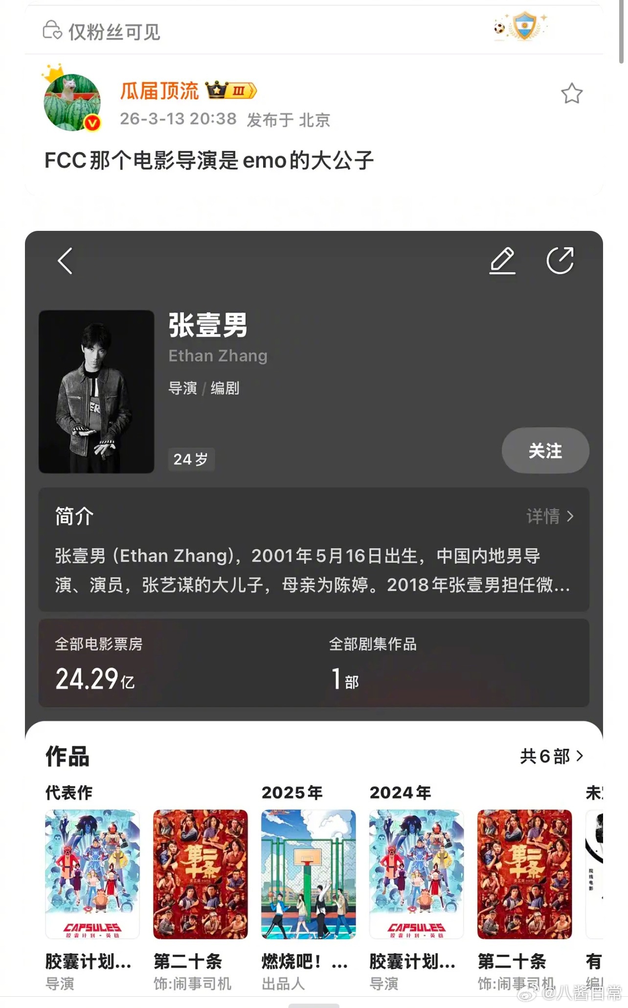 🍉赵今麦、范丞丞主演新电影的导演是张艺谋儿子