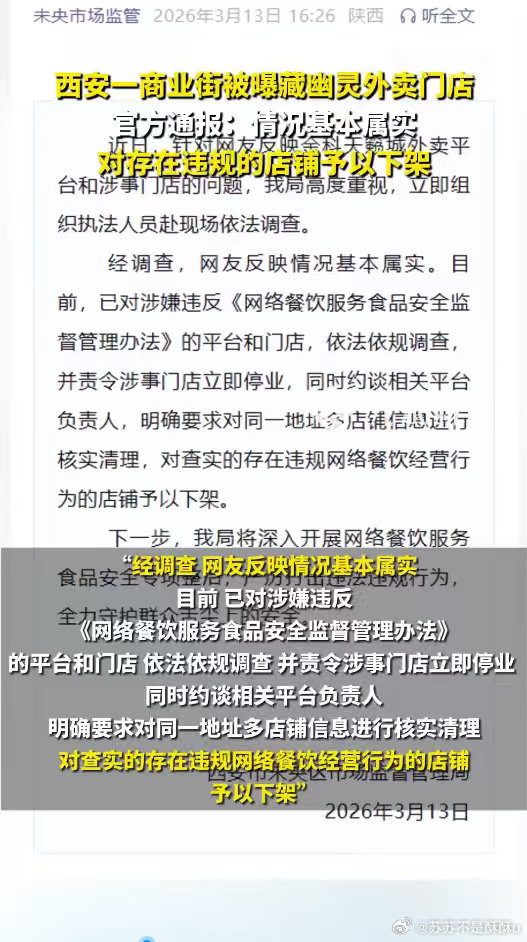 商业街被曝藏幽灵外卖门店已停业商业街藏幽灵外卖情况基本属实官方通报商业街幽灵外卖问题基本属实,所有涉事门店均已停业,平台同步清理违规外卖商户保障用餐安全。