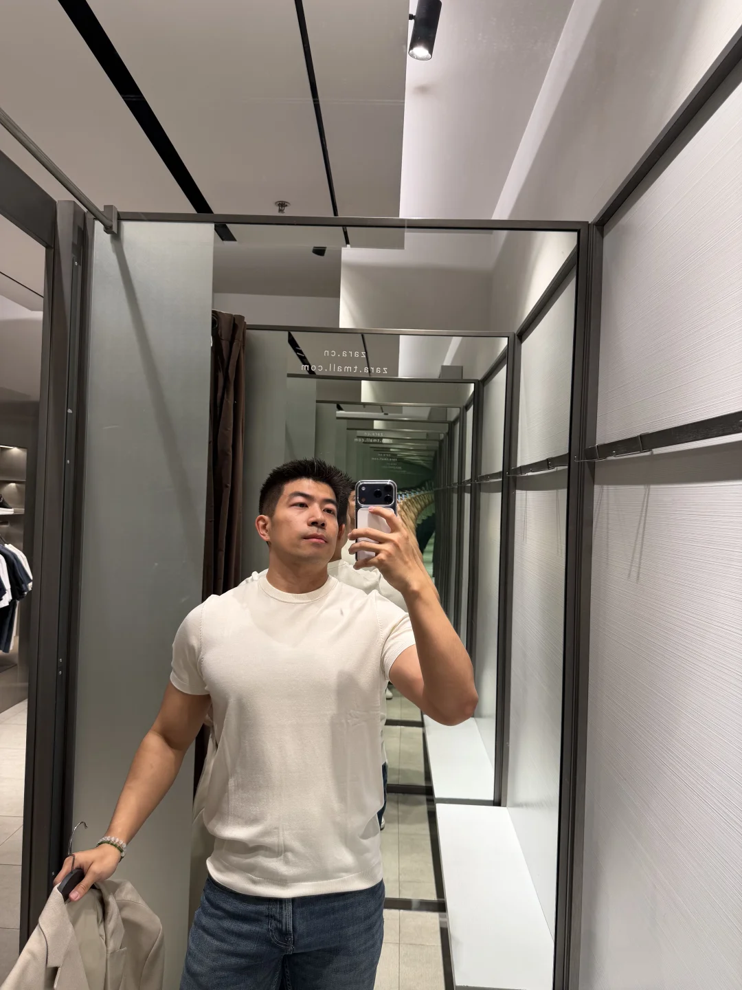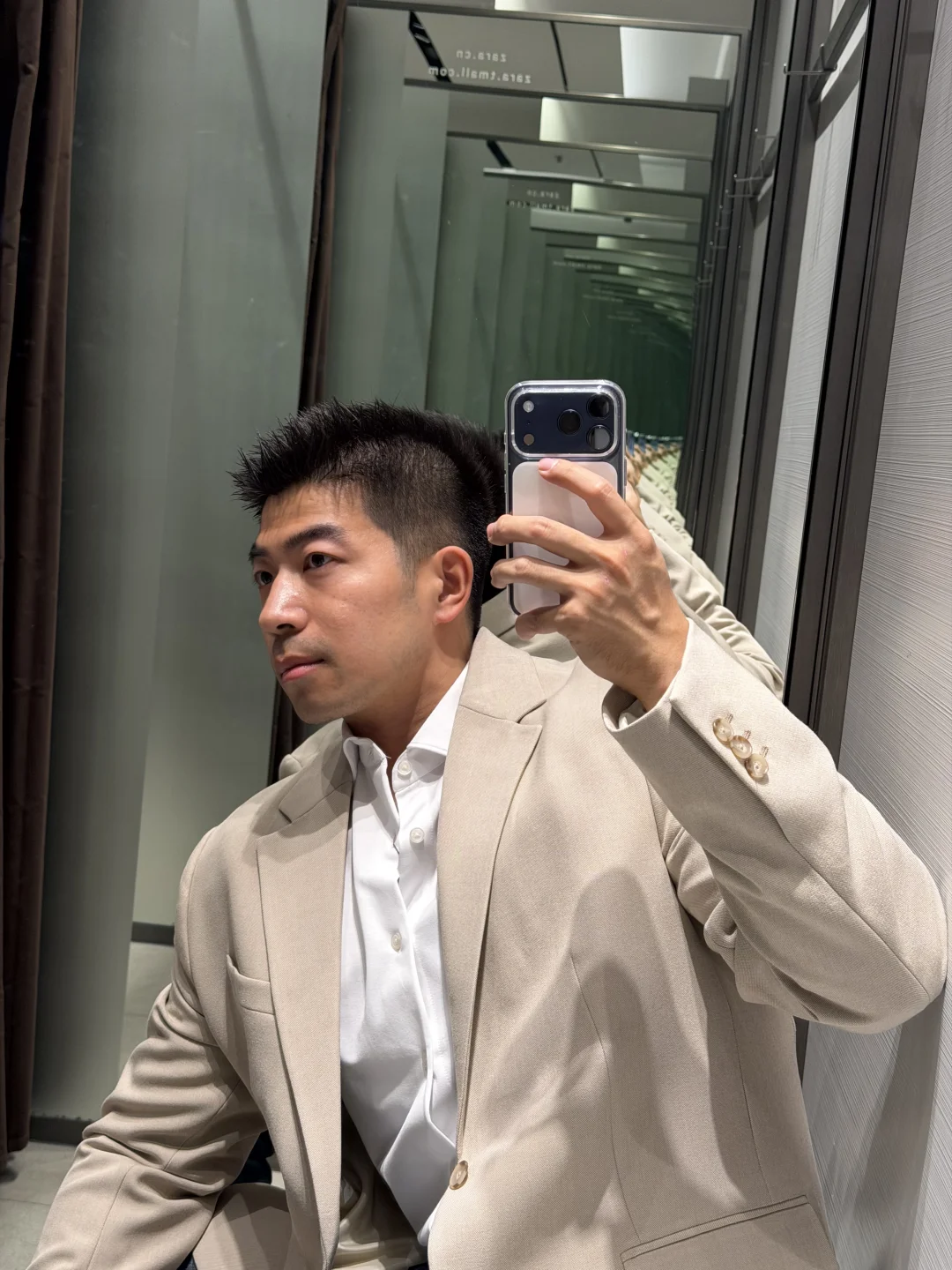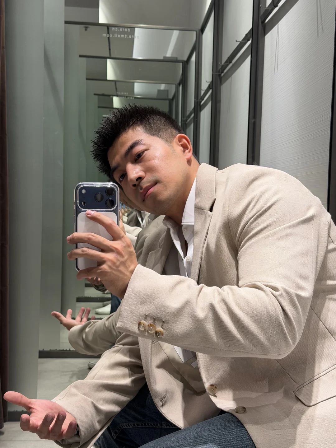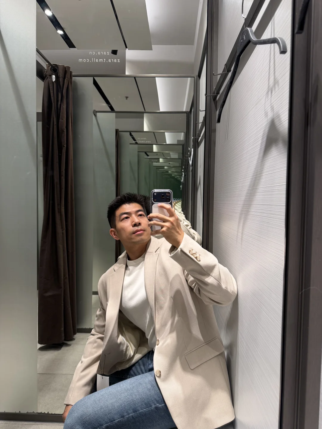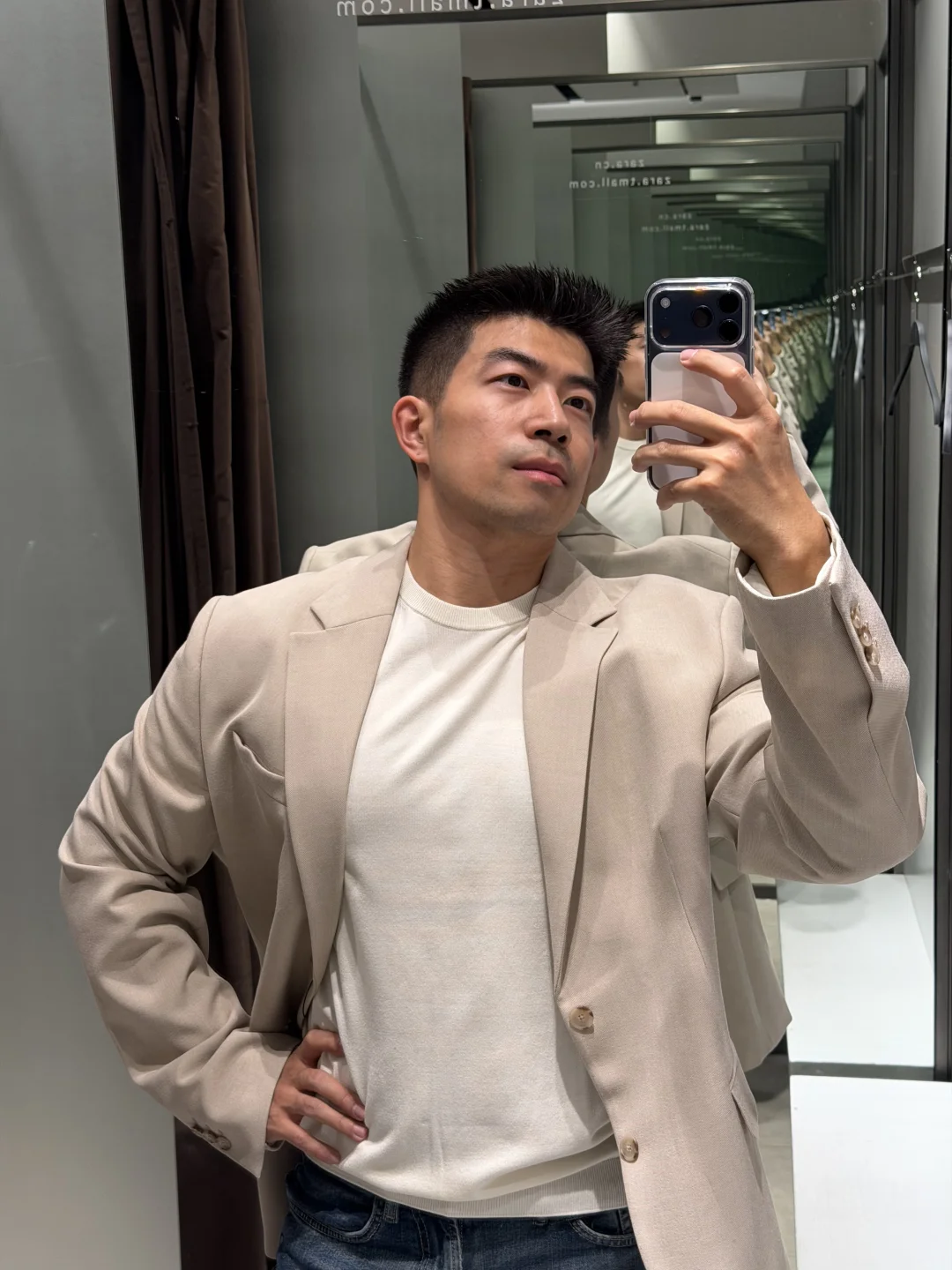 下个月要参加同学婚礼,服装要求浅色系。 我的策略是: 上身 卡其色休闲西装外套 内搭 A 白色衬衣 丨 B 针织短袖T恤 下身 修身深色弹力牛仔裤👖 帮我看看哪个更合适呢😊