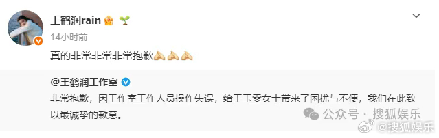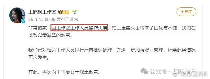 王鹤润称没有理由和借口昨晚,有网友发现王鹤润微博大号吐槽王玉雯,场面尴尬,引发热议。随后王鹤润工作室以及本人道歉,称是工作人员操作失误导致。话说王鹤润发生过好多尴尬的事情啊,这个特殊体质也是......详情→网页链接 王鹤润吐槽王玉雯