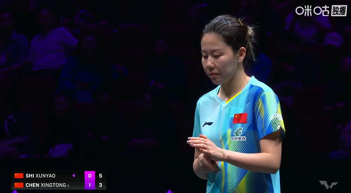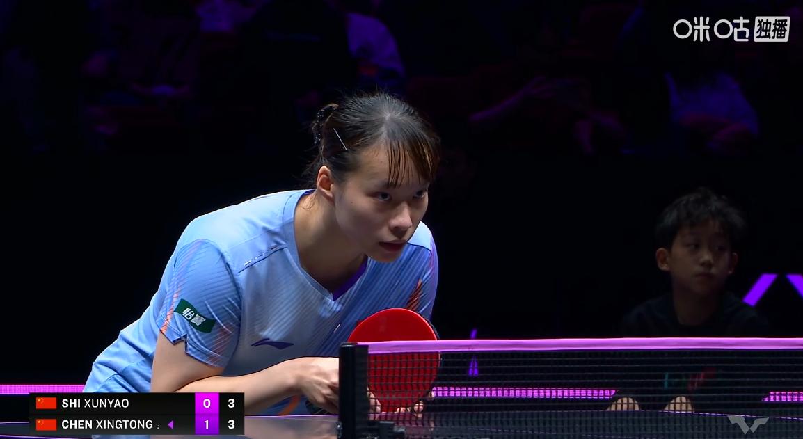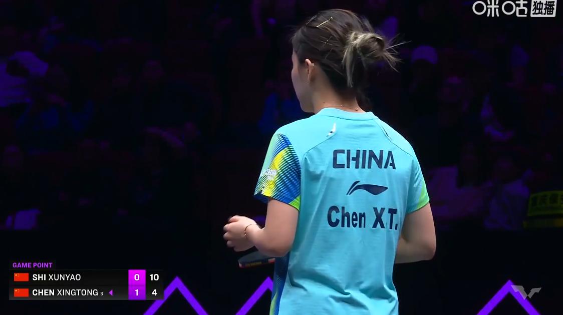 周雨直言:石洵瑶的单板厚度太重了, 完全不输莎莎的正手, 怪不得都说莎莎最不想遇到的对手是石洵瑶, 第二局石洵瑶加强了反手质量, 打了同同一个3:1, 同同作为老将节奏把握上还是非常稳定, 给人一种四平八稳的感觉, 石洵瑶则是前后不断的移动位置, 双方紧咬着比分,打成5:3,石洵瑶暂时领先, 裁判出来控制一下节奏, 提醒石洵瑶发球回抛, 石洵瑶反手加旋转了, 将比分拉开到7:3, 同同的稳扎稳打给了石洵瑶更多的搏杀机会, 从3:3打到了9:3,石洵瑶连得6分, 10:3,石洵瑶拿到局点, 同同反手出界, 11:4,石洵瑶成功扳回一城