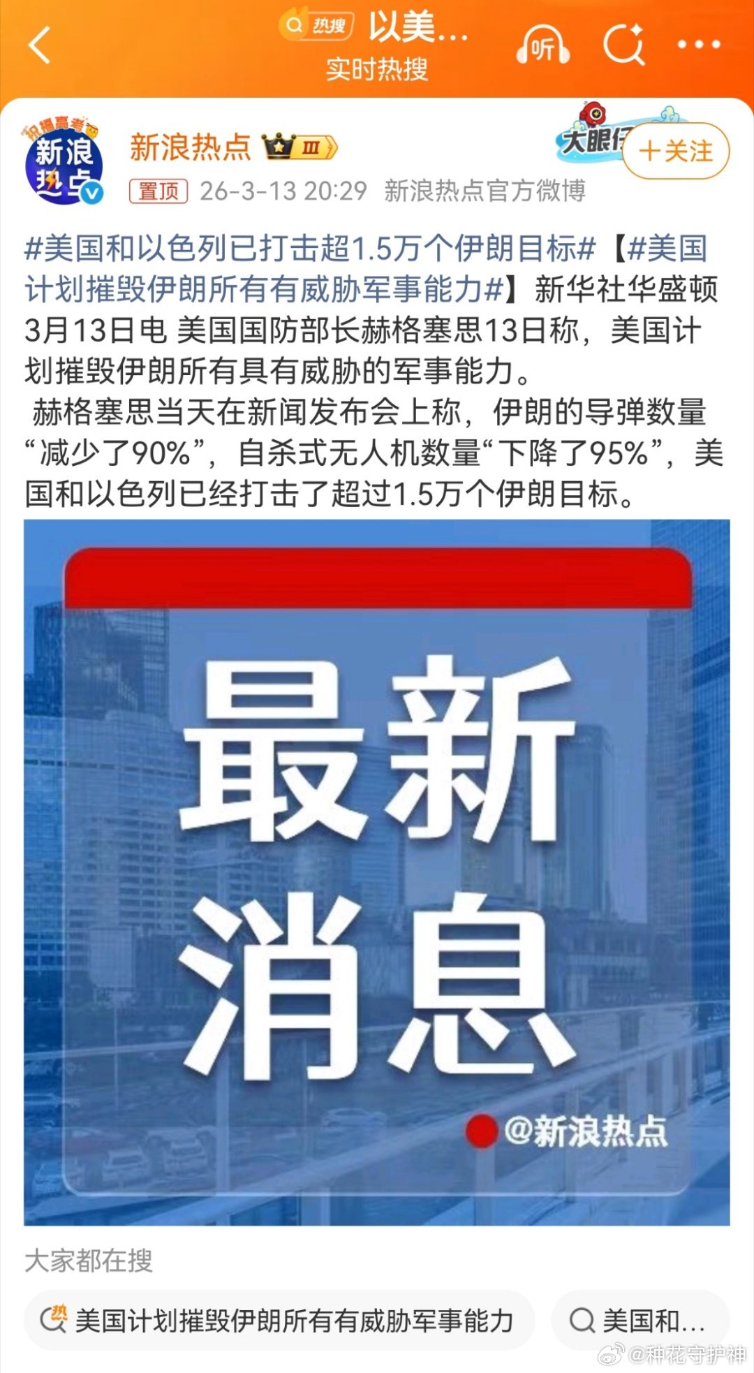 格塞思当天在新闻发布会上称,伊朗的导弹数量“减少了90%”,自杀式无人机数量“下降了95%”,美国和以色列已经打击了超过1.5万个伊朗目标。