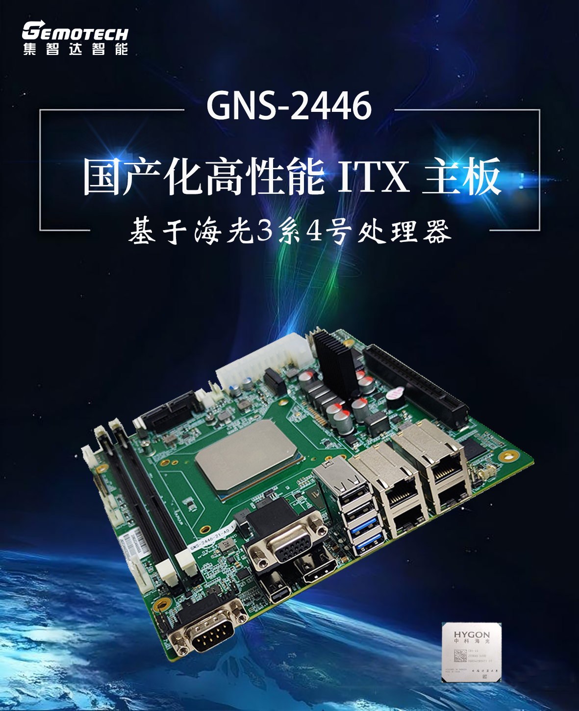 GNS-2446 采用全国产化器件,Mini-ITX 兼容版型(185mm×170mm)适配空间受限场景。核心支持海光4号高性能国产处理器,搭配 DDR5 non-ECC 高速内存(最大128GB),板载高性能GPU ,支持三屏独立输出(HDMI/Mini DP 4K@60Hz, VGA 1080P@60Hz),兼顾强算力与图形处理能力和多路显示输出。